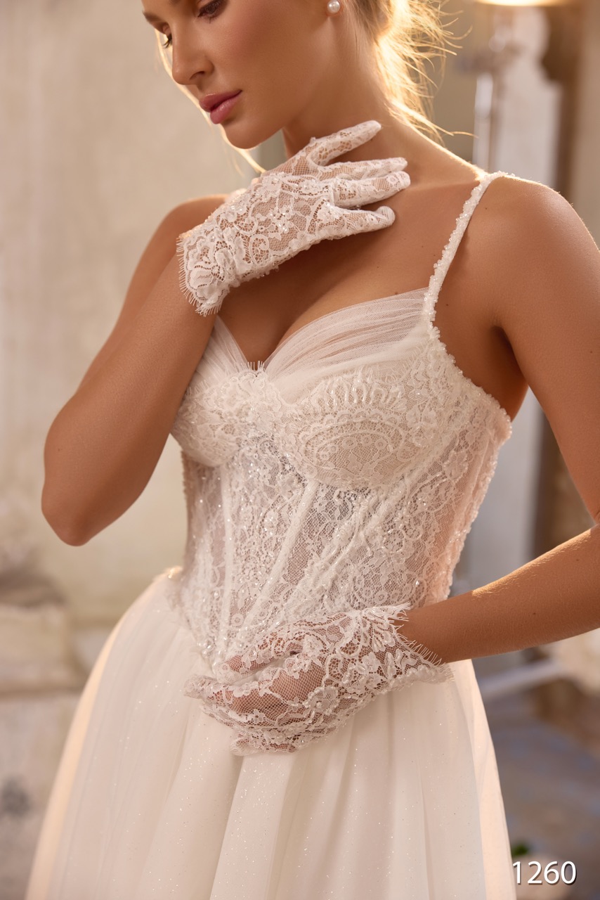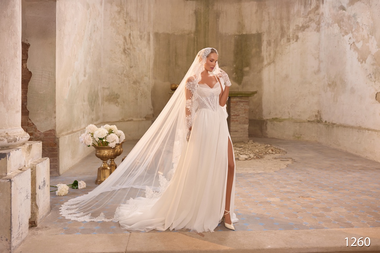 Um modelo A-Line que combina a fluidez do chiffon com o detalhe da renda. O corpete é um cai-cai estilo corset bustier adornado com renda delicada. A saia leve de chiffon apresenta uma racha ousada. Pode ser conjugado com um véu longo em renda, que confere um look dramático e elegante, perfeito para a noiva que procura leveza e sensualidade.