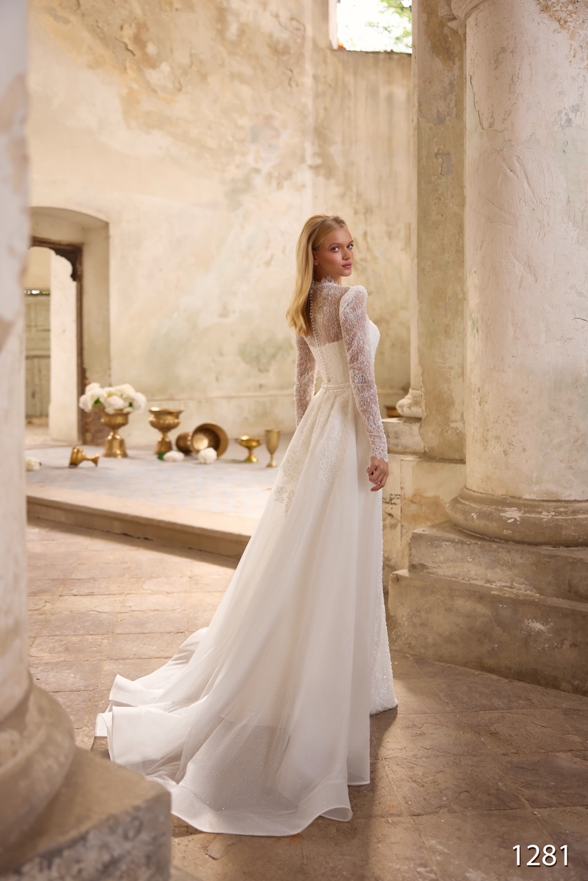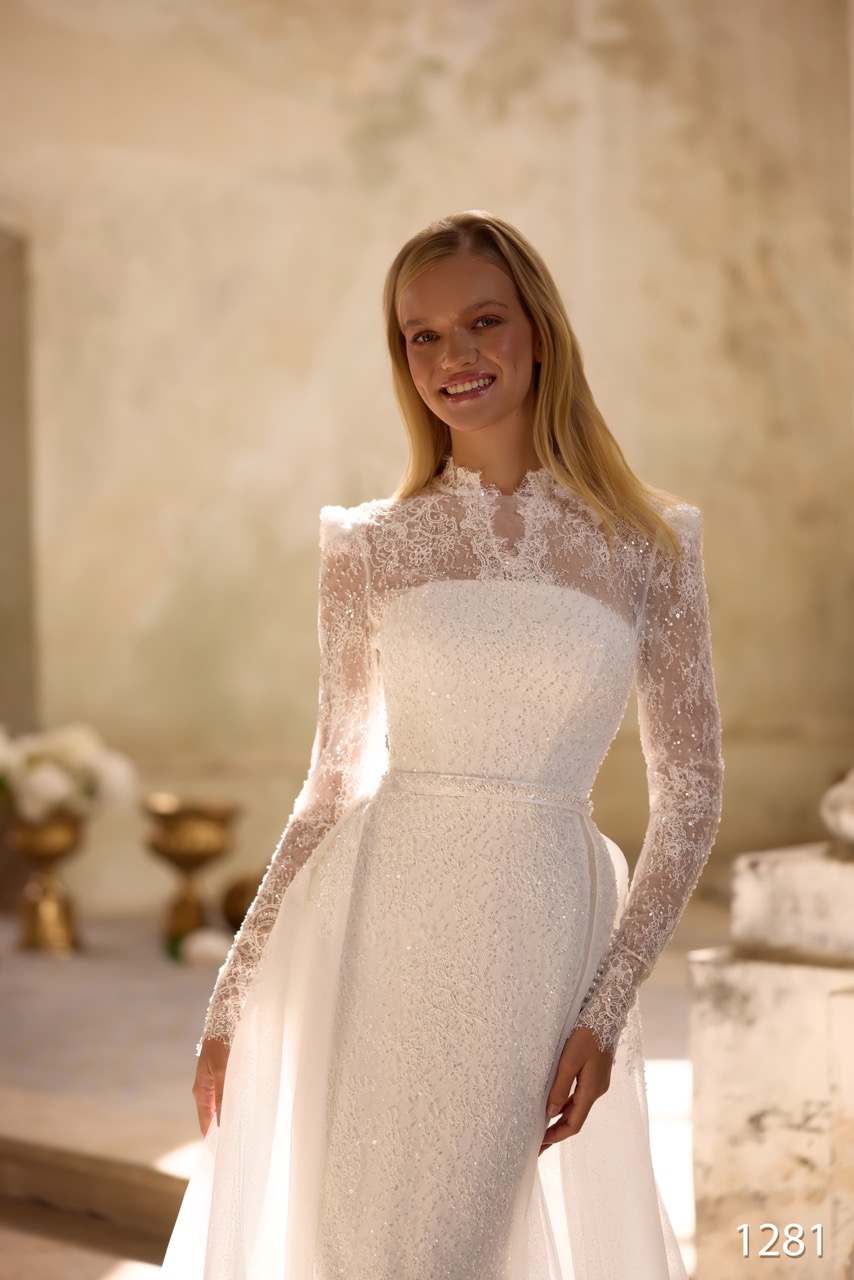 Um vestido de silhueta sereia que é a essência do luxo e da feminilidade dramática. O corpo inteiro é coberto por um tecido bordado com brilho intenso (glitter/lantejoulas). O grande destaque é o corpete ilusão de renda de gola alta com mangas compridas justas e detalhe nos ombros, oferecendo uma cobertura elegante sem perder o requinte. É um look que combina a sensualidade da silhueta ajustada com a sofisticação da renda de manga comprida.