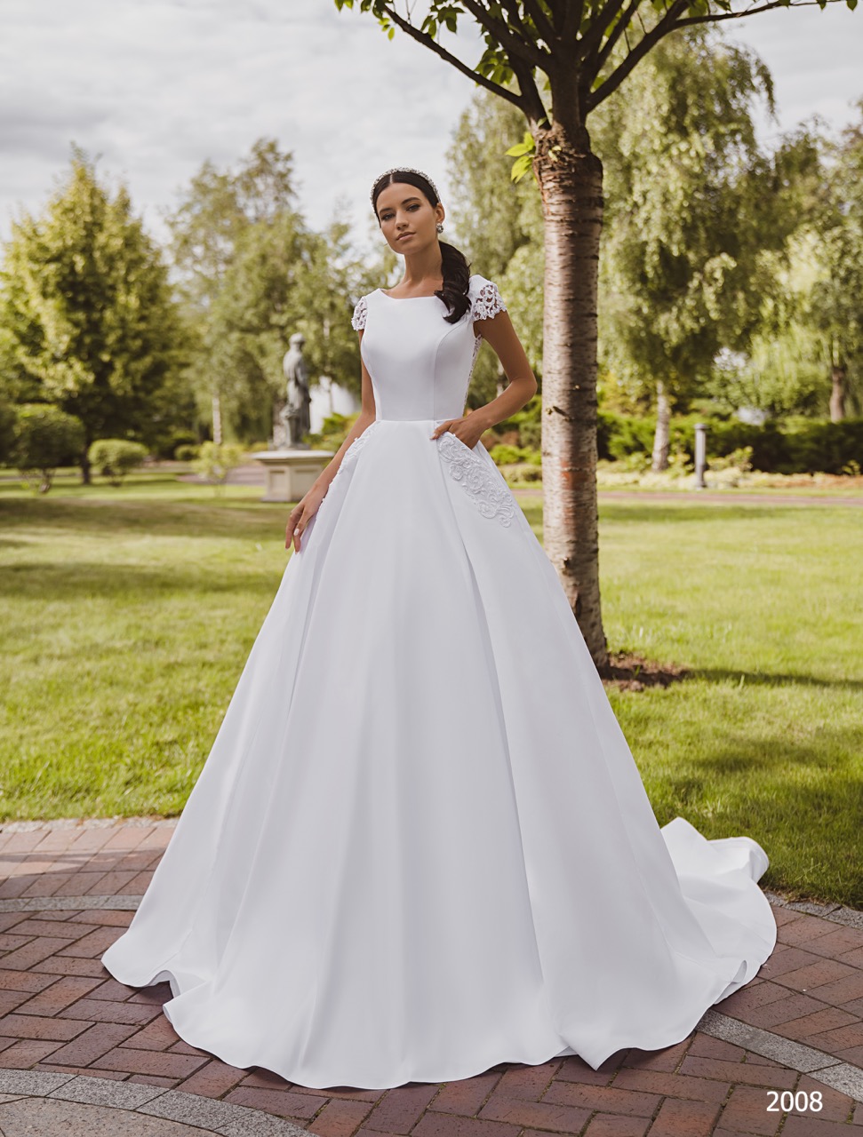 O Modelo 2008 é um vestido que personifica a elegância régia através de uma silhueta de corte Princesa sumptuosa. O seu design é marcado pela nobreza do tecido, um cetim ou mikado liso de luxo, que confere à vasta saia um volume estruturado e um caimento impecável, mantendo a superfície imaculada e brilhante. No corpete, a simplicidade transforma-se em requinte com um decote à barco, que desliza horizontalmente sobre as clavículas, conferindo uma pose delicada e elegante ao pescoço e ombros. Este é complementado por umas mangas curta de um tule ou renda intrincada, que adicionam um contraste textural suave e romântico ao liso do cetim. A verdadeira surpresa moderna reside na própria saia, onde, com um toque de irreverência e praticidade, se escondem bolsos laterais discretos e elegantemente dissimulados nas pregas. Alguns detalhes em aplicações de renda ou bordados podem ser observados ligeiramente acima do bolso, quebrando a uniformidade do tecido e ligando o corpete à saia de forma sofisticada. Este vestido é a escolha perfeita para a noiva que sonha com o glamour de um conto de fadas, mas com a sofisticação de um design atual.