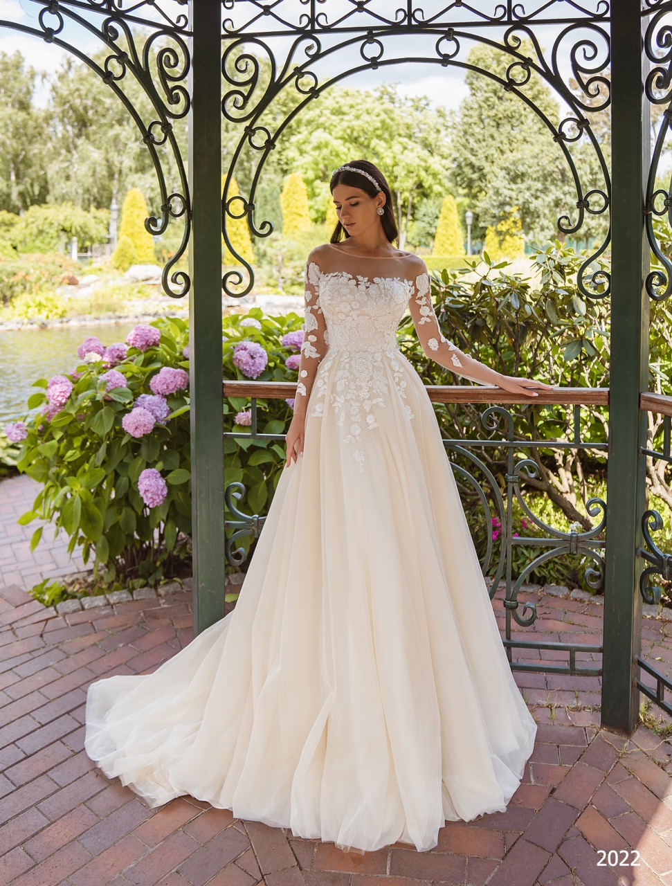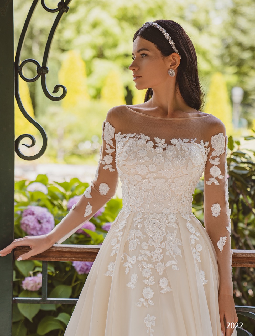 O modelo 2022 é um vestido que evoca um romantismo clássico e intemporal, combinando a sofisticação de um corte majestoso com a delicadeza da renda em camadas. O seu design apresenta uma silhueta de princesa suave, com uma saia de tule que flui graciosamente, conferindo volume e um movimento suave e etéreo ao caminhar. O grande destaque reside na mestria do corpete e das mangas compridas. Estas são feitas em tule ilusão, uma malha quase invisível, sobre a qual flores e arabescos de renda rica são meticulosamente aplicados, subindo e descendo pelos braços e colo. O Decote é do tipo canoa ou barco na parte exterior (ilusão), mas por baixo revela uma forma de Coração (sweetheart) no forro, criando uma dimensão elegante e sensual. As aplicações de renda não se restringem ao corpete, prolongando-se e dispersando-se elegantemente pela saia, criando uma continuidade visual que alonga a figura. O 2022 é ideal para a noiva que procura um equilíbrio entre a cobertura e a delicadeza, garantindo um look sofisticado e requintado, perfeito para qualquer estação.