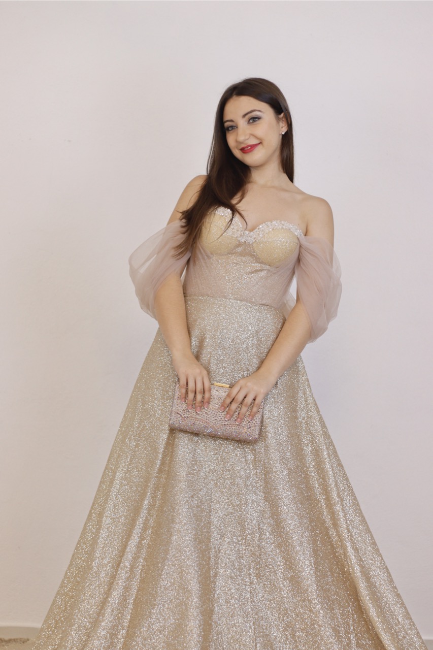Este magnífico vestido de gala é o equilíbrio perfeito entre o glamour clássico e o romantismo moderno. Com uma base num sofisticado tom nude/champanhe, a peça é inteiramente recoberta por um brilho cintilante que captura a luz de forma deslumbrante, garantindo que seja o centro das atenções em qualquer evento. O design destaca-se pelo seu feminino decote de ombro a ombro, realçado por mangas bufantes em tule leve que conferem um ar etéreo e delicado ao visual. O corpete estruturado, com um elegante decote em coração, define a silhueta com precisão, enquanto a saia de corte em “A” flui graciosamente até ao chão, criando um movimento fluido e majestoso.