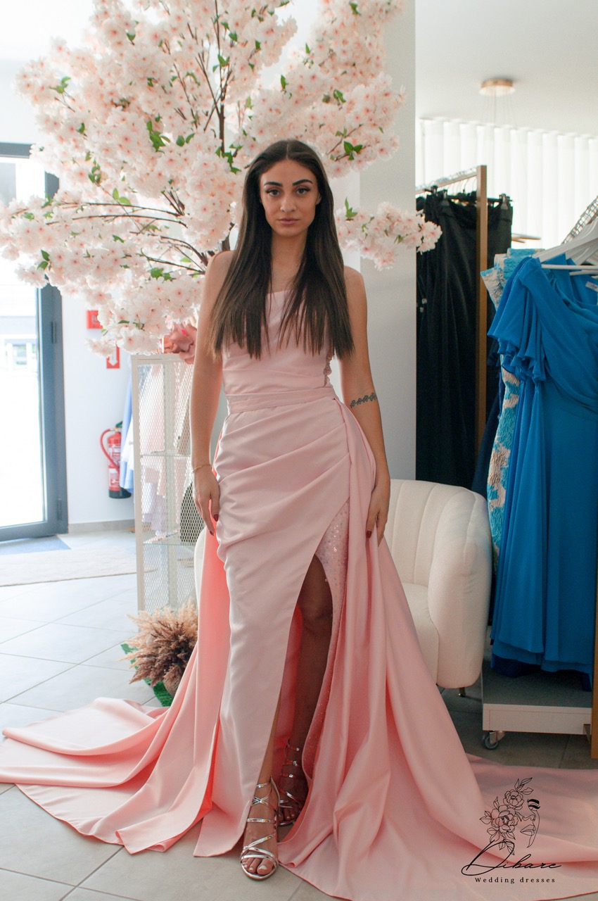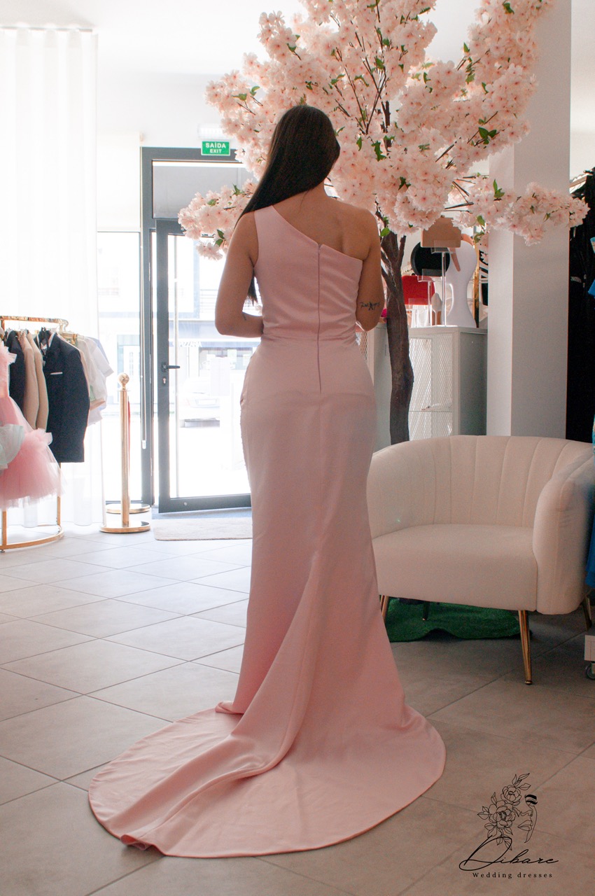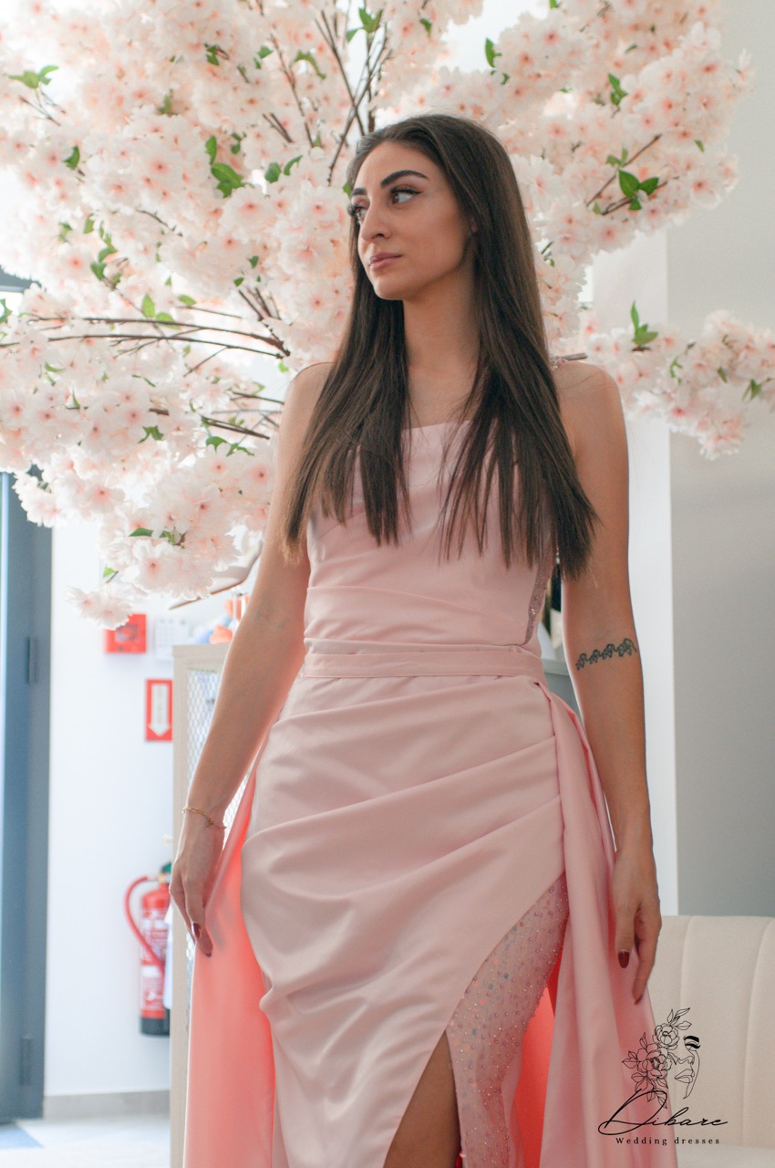 O modelo 2610 é uma peça de alta sofisticação que combina texturas contrastantes para um efeito visual moderno. Apresenta um corte assimétrico de um só ombro, com uma alça ricamente decorada em pedraria e lantejoulas que descem lateralmente pelo corpo. A base do vestido é composta por um tecido cintilante e texturizado, parcialmente coberto por uma elegante sobreposição de cetim liso que se abre numa generosa racha frontal. O design é finalizado com uma cauda fluida, tornando-o a escolha perfeita para eventos de passadeira vermelha ou festas exclusivas.