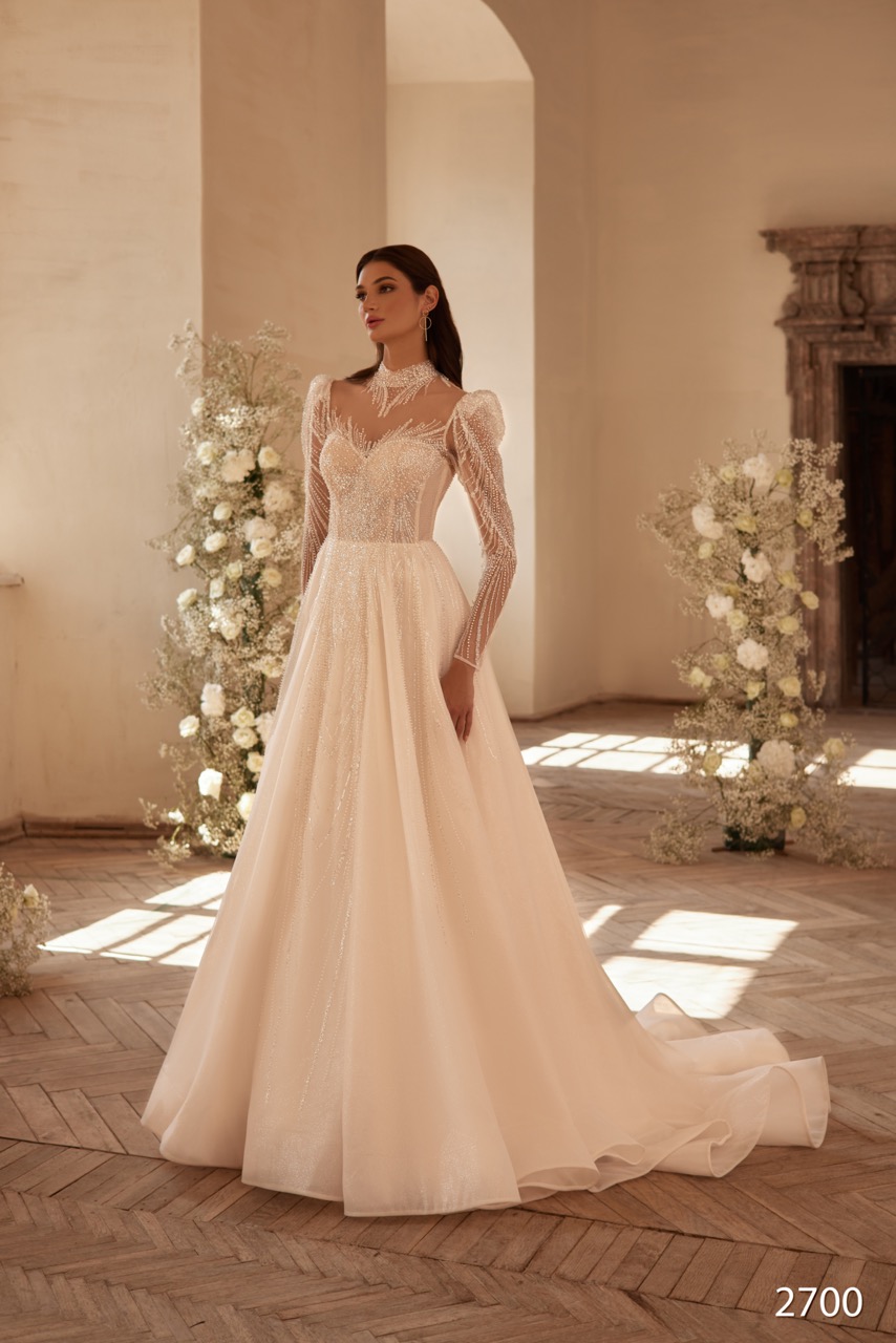 O modelo 2700 é um vestido que evoca o luxo romântico com um toque de design clássico e vintage, ideal para a noiva que procura um brilho sutil e uma silhueta imponente. A sua silhueta é de Corte Princesa (Ballgown), com uma saia ampla e fluida, construída em múltiplas camadas de tule com glitter ou micro-lantejoulas, conferindo um efeito cintilante e onírico a cada movimento. O grande ponto focal e mais sofisticado reside no corpete e nas mangas compridas. O vestido apresenta um decote ilusão com uma Gola Alta sutil e delicada, que se liga às Mangas Compridas justas e fit, ambas feitas em tule transparente adornado com bordados e beading finíssimo que sobem pelo colo e pelos braços. Este detalhe cria a ilusão de que a renda e o brilho estão diretamente sobre a pele, conferindo um look elegante e coberto. O corpete possui ainda um design mais estruturado por baixo da camada ilusória, geralmente em formato Coração (sweetheart), que é totalmente coberto por beading e micro-lantejoulas, marcando a cintura de forma clara. O 2700 é a escolha perfeita para a noiva que deseja um vestido de grande volume, repleto de brilho discreto e com a elegância atemporal da manga comprida.