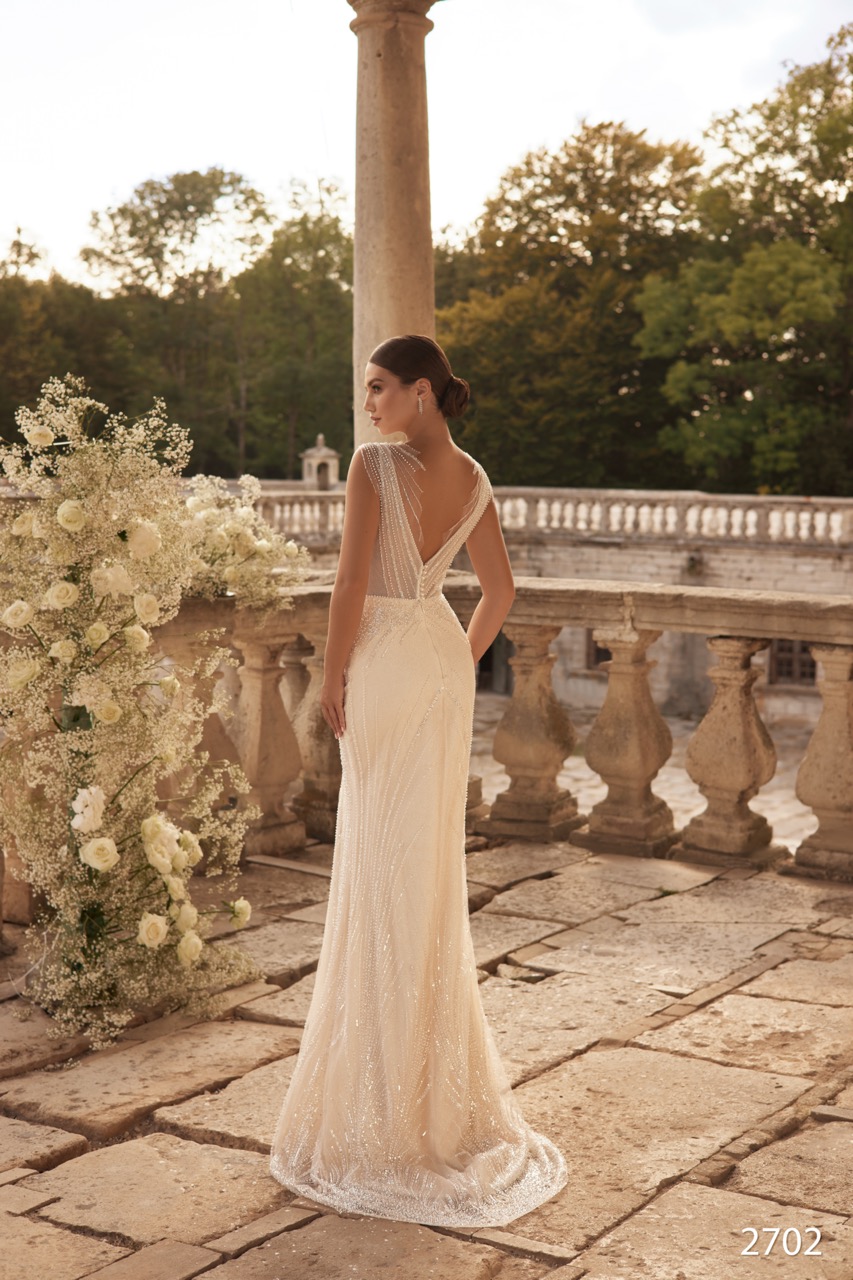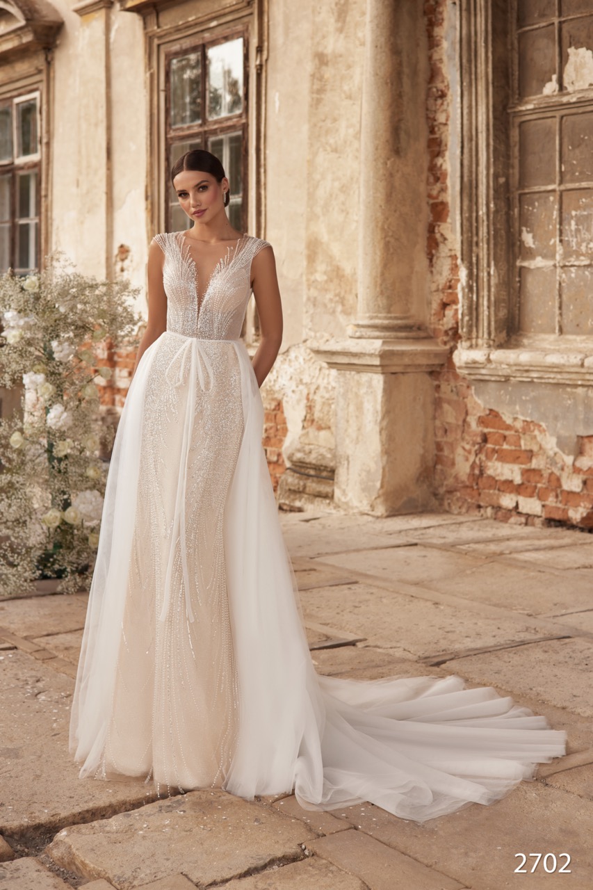 O Modelo 2702 é a personificação da versatilidade luxuosa, oferecendo dois visuais numa única peça. O vestido principal apresenta uma silhueta sereia ajustada, coberta por bordados, beading e padrões intrincados que conferem um brilho intenso a toda a superfície, realçando a figura com sofisticação. O corpete é moderno e sensual, com um decote em V profundo que se estende elegantemente pelo busto, frequentemente coberto por uma fina camada de tule ilusão para maior delicadeza. O corpete é complementado por alças largas ou pequenas mangas em tule illusion, igualmente bordadas com beading que irradia a partir do centro, criando um efeito de luz. A característica definidora do 2702 é a Saia amovível sobreposta. Esta saia é feita de tule leve e fluído e é fixada à cintura do vestido sereia através de uma faixa ou laço delicado. Ao ser sobreposta, a saia transforma instantaneamente o vestido num corte princesa majestoso e volumoso, ideal para a cerimónia. Uma vez removida, a noiva revela o vestido sereia cintilante por baixo, perfeito para a festa.