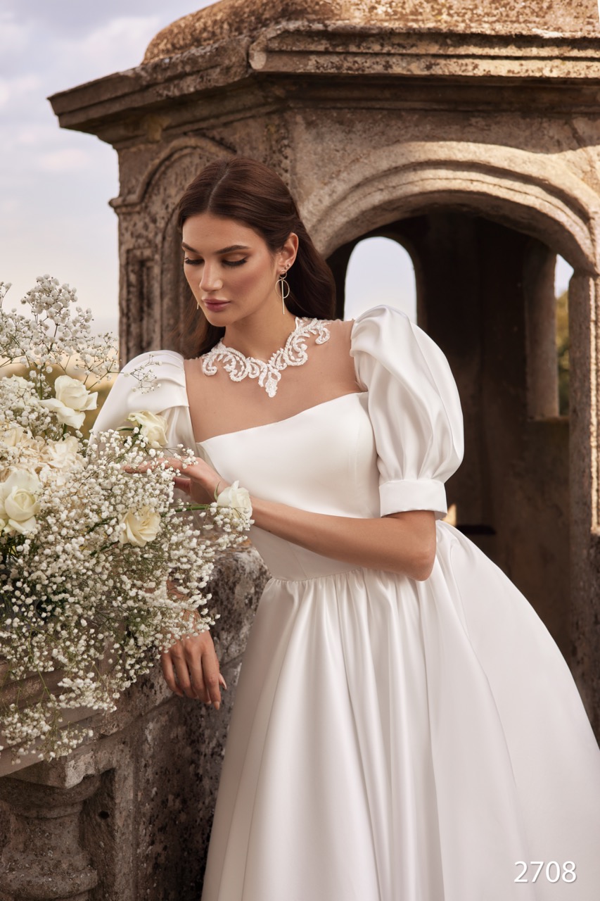O Modelo 2708 é um vestido que presta homenagem à elegância clássica e vintage, apresentando uma silhueta dramática com um foco claro no design de manga. A sua silhueta é de Corte Princesa (Ballgown), com uma saia ampla e estruturada, feita de Cetim ou Mikado liso e de alta qualidade. Este tecido confere à peça um brilho sutil e uma aparência limpa e luxuosa, com pregas bem definidas que se estendem até à cauda. O corpete é elegante e minimalista, apresentando um Decote Quadrado moderno e lisonjeiro, suportado por um design de gola elegante. O grande destaque deste modelo são as Mangas. As mangas são curtas (ou na altura do cotovelo) e possuem um volume impressionante, no estilo Manga Balão (Puff Sleeves). Esta escolha confere um toque retrô e dramático ao design, contrastando a delicadeza das mangas com a solidez do cetim liso. O vestido é frequentemente complementado por um cinto fino que marca a cintura, e o minimalismo do cetim liso permite que o foco recaia sobre a silhueta, as mangas e, opcionalmente, o uso de joalharia, como o colar de pérolas que se vê na fotografia. O 2708 é perfeito para a noiva que deseja um visual elegante, intemporal e com um toque de glamour histórico.