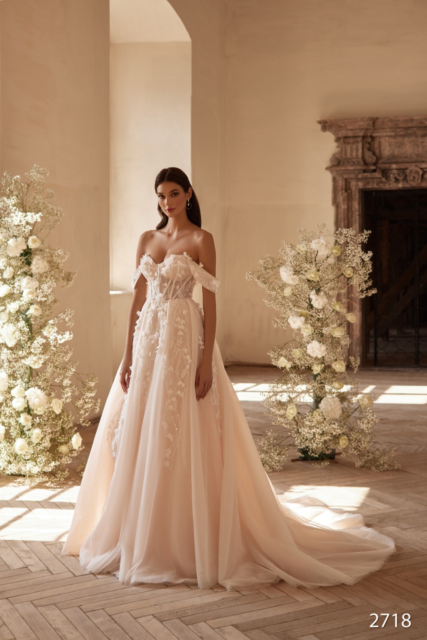 O modelo 2718 é uma peça que exalta o romantismo boémio e a feminilidade, apresentando uma Silhueta em Linha A fluida e um toque de cor. O vestido é construído em camadas de tule suave com um forro em tom blush ou nude, conferindo uma profundidade e calor subtil à cor tradicional. O corpete é a peça central, com um Decote em Coração profundo e sensual. O corpo é decorado com profusas aplicações florais em 3D e renda em relevo que parecem flutuar sobre a pele graças ao uso de tule ilusão no decote e ombros. O design inclui mangas de ombro caído e com mangas longas amoviveis, delicadas e finas, feitas do mesmo tecido floral. A principal característica deste modelo é a sua construção leve e delicada, com as aplicações florais a descerem organicamente do corpete para a saia, criando uma continuidade visual deslumbrante.