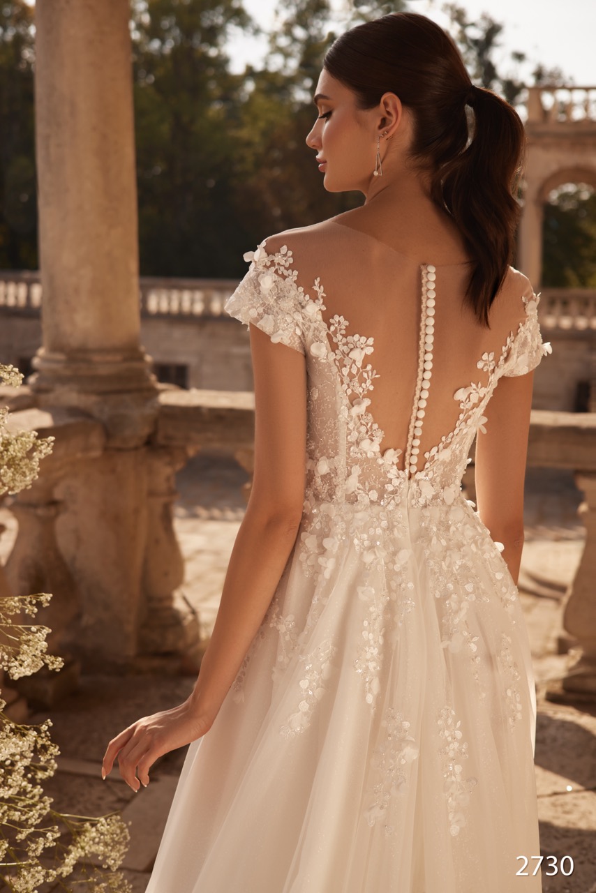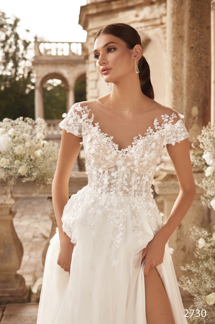 Modelo 2730 é um vestido que celebra a delicadeza do romantismo floral com uma silhueta fluida e um toque de ousadia moderna, ideal para a noiva que procura um visual etéreo. A sua silhueta é de Linha A (A-Line) ou Princesa suave, com uma saia ampla e fluida, construída em camadas de tule leve que conferem um movimento gracioso. O tecido da saia é adornado com aplicações de renda floral e beading sutil, que se dispersam organicamente do corpete até à barra. O corpete é o ponto focal de textura e design. Apresenta um Decote em V Profundo (Plunge V), elegantemente coberto por tule ilusão que proporciona suporte e delicadeza. O corpete é ricamente adornado com aplicações de flores e folhagens em 3D e beading, que sobem pelo colo e pelos ombros, formando alças finas. O grande elemento de design moderno é a rachada lateral (slit) alta na saia. Esta abertura confere movimento e revela a perna ao caminhar, injetando uma sensualidade inesperada no design de princesa. O 2730 é um modelo luxuoso que equilibra a beleza da renda floral tridimensional com a leveza da saia e a ousadia do slit.
