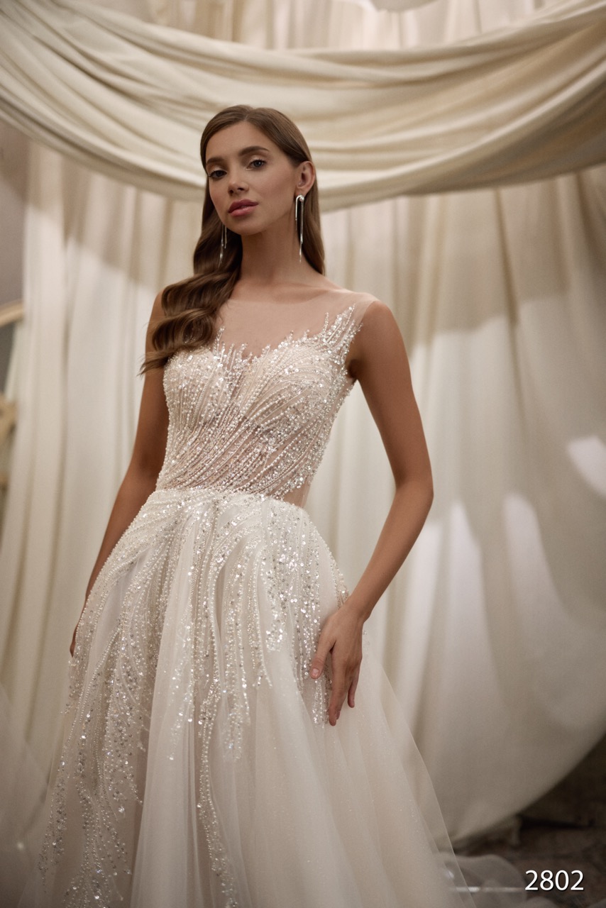 Este vestido é uma verdadeira celebração do brilho e da leveza, ideal para noivas que desejam um visual de conto de fadas moderno. O modelo apresenta um corpete primorosamente trabalhado com bordados lineares e orgânicos em pedraria, que fluem organicamente pela cintura até à saia, criando um efeito de cascata luminosa. Com um decote ilusão sutil e uma silhueta em linha A, a peça combina a transparência delicada do tule com uma saia volumosa e fluida que termina numa cauda graciosa. É a escolha perfeita para um evento glamoroso, oferecendo um brilho sofisticado que capta a luz a cada movimento.