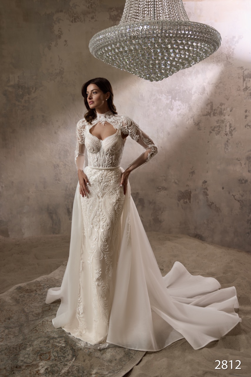 Este sofisticado vestido de silhueta sereia oferece dois looks num só graças ao seu bolero de gola alta e mangas compridas removível, ricamente trabalhado em renda e pedraria. O vestido principal apresenta um corpete estruturado com decote coração e uma cauda fluida em sobreposição, criando um visual luxuoso, detalhado e versátil.
