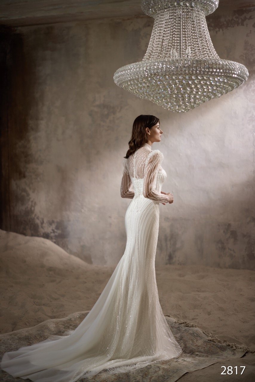 Este vestido de noiva exala uma elegância majestosa e sofisticada, destacando-se pela sua silhueta ajustada e detalhes luxuosos. O design apresenta uma gola alta e mangas compridas em tule transparente, inteiramente decoradas com padrões lineares de pedraria que criam um efeito de brilho radiante sob a luz. O corpo do vestido possui uma textura cintilante com drapeados delicados que acentuam a figura, sendo complementado por uma sobresaia volumosa e fluida que adiciona drama e uma cauda imponente ao visual. É uma peça que une perfeitamente a modéstia refinada com o glamour da alta costura, ideal para uma cerimónia clássica e luxuosa.
