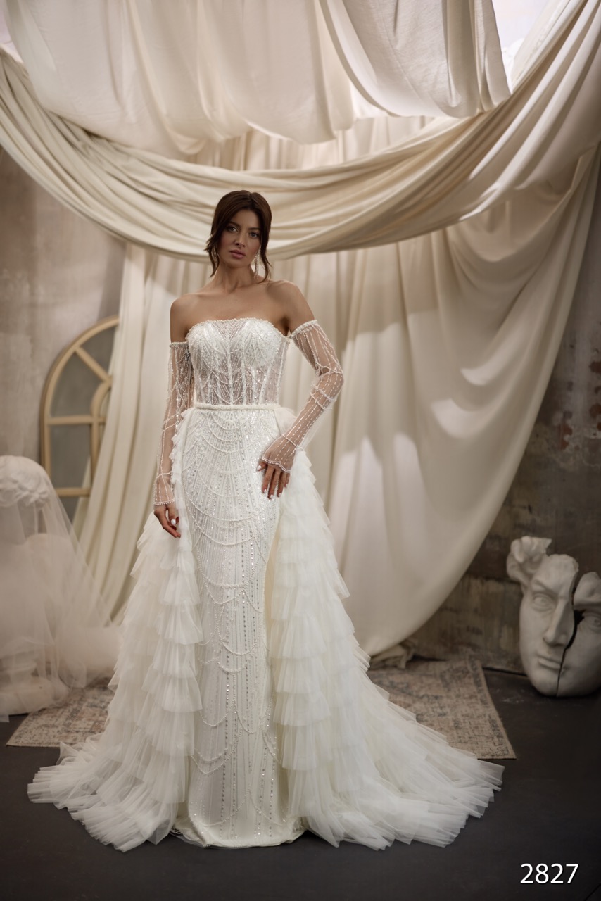 Este deslumbrante vestido de corte sereia destaca-se pelo seu intrincado bordado de lantejoulas e missangas que criam um padrão geométrico e glamoroso em toda a peça. O corpete estruturado, em estilo corset com transparências, realça a silhueta com sofisticação. O grande diferencial deste modelo é a inclusão de uma saia sobreposta removível, que permite transformar o visual de uma silhueta ajustada num look mais volumoso e majestoso para a cerimónia.