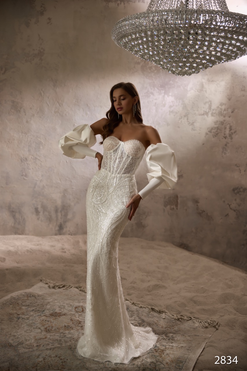 Este elegante vestido destaca-se pelo seu design ombro a ombro com um delicado drapeado no busto, que confere um ar romântico e clássico. O contraste é criado pelas mangas compridas em renda trabalhada, que se fundem com uma saia fluida de racha profunda, revelando uma camada interior também em renda. É a escolha perfeita para a noiva que procura um equilíbrio entre a fluidez dos tecidos lisos e o detalhe sofisticado da renda tradicional.