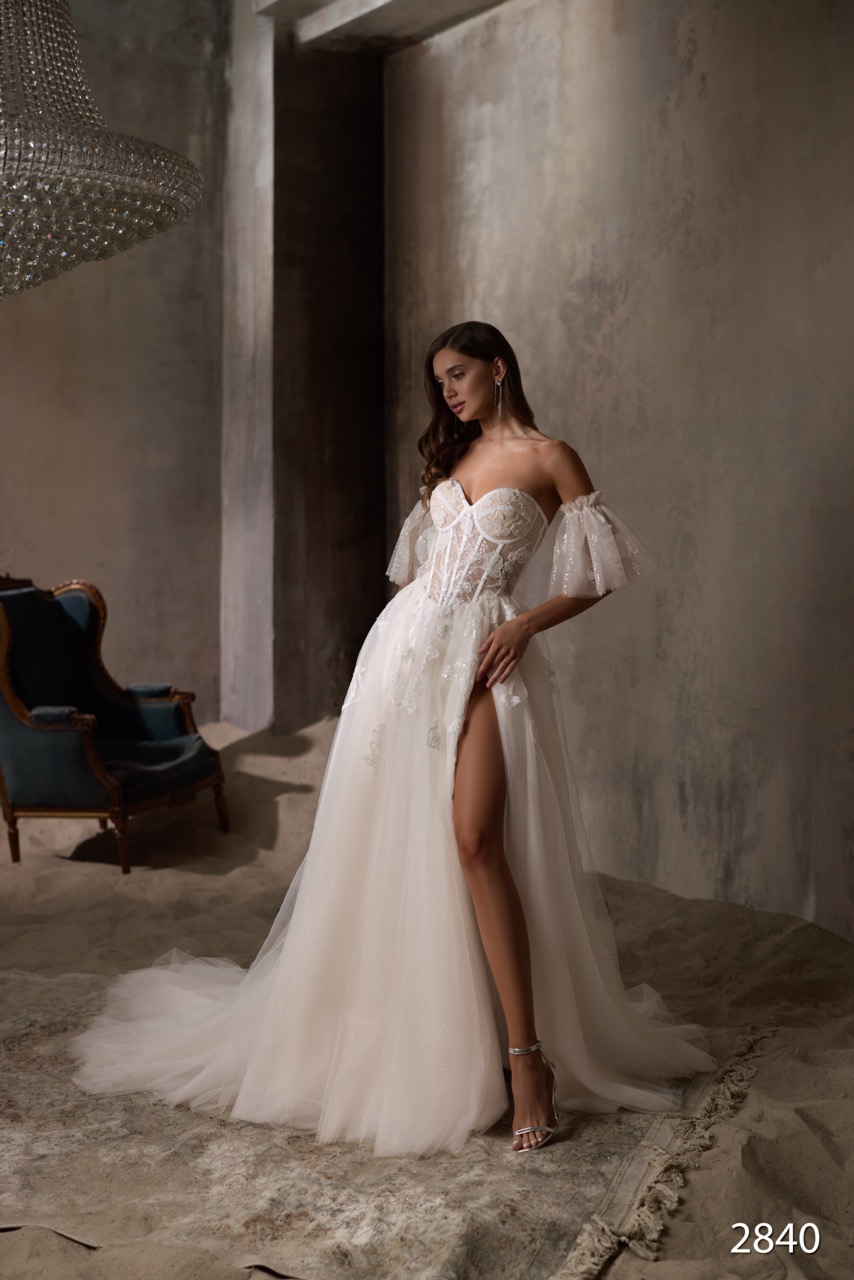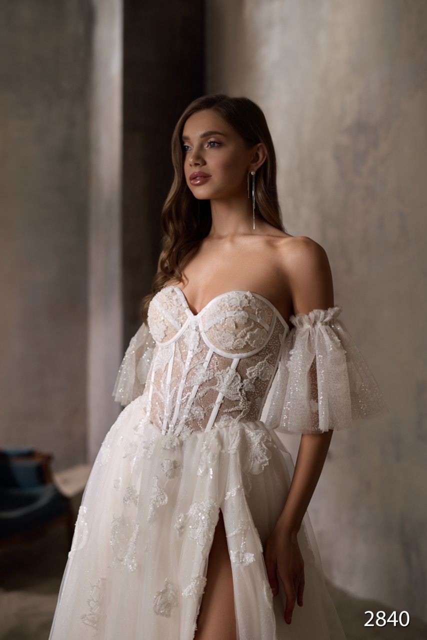 Este vestido romântico e delicado apresenta um corpete estilo corset transparente, adornado com aplicações florais bordadas que realçam a silhueta. A saia volumosa em tule leve, com um brilho subtil e fluidez encantadora, cria um visual de noiva clássico com um toque contemporâneo de sensualidade e elegância.