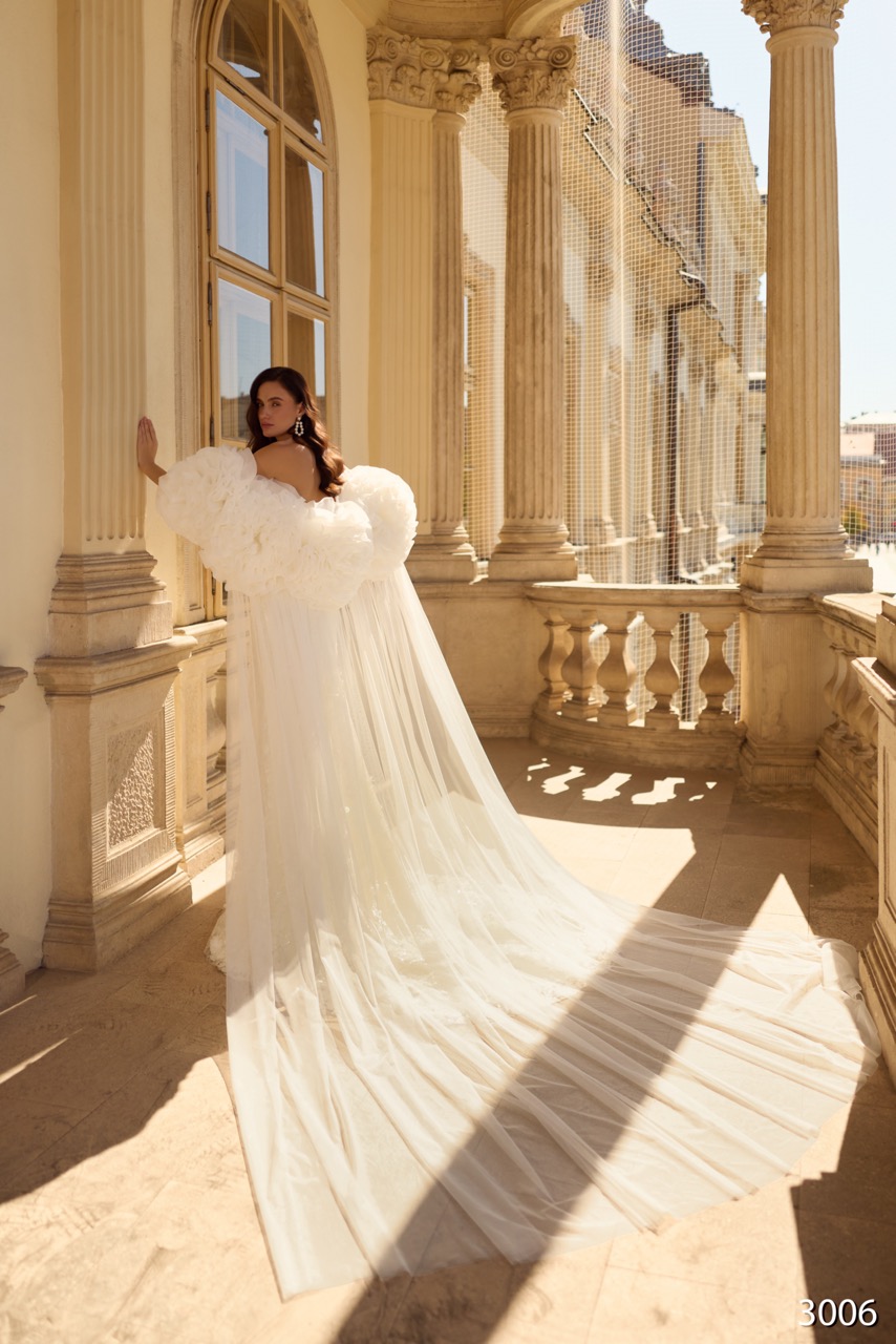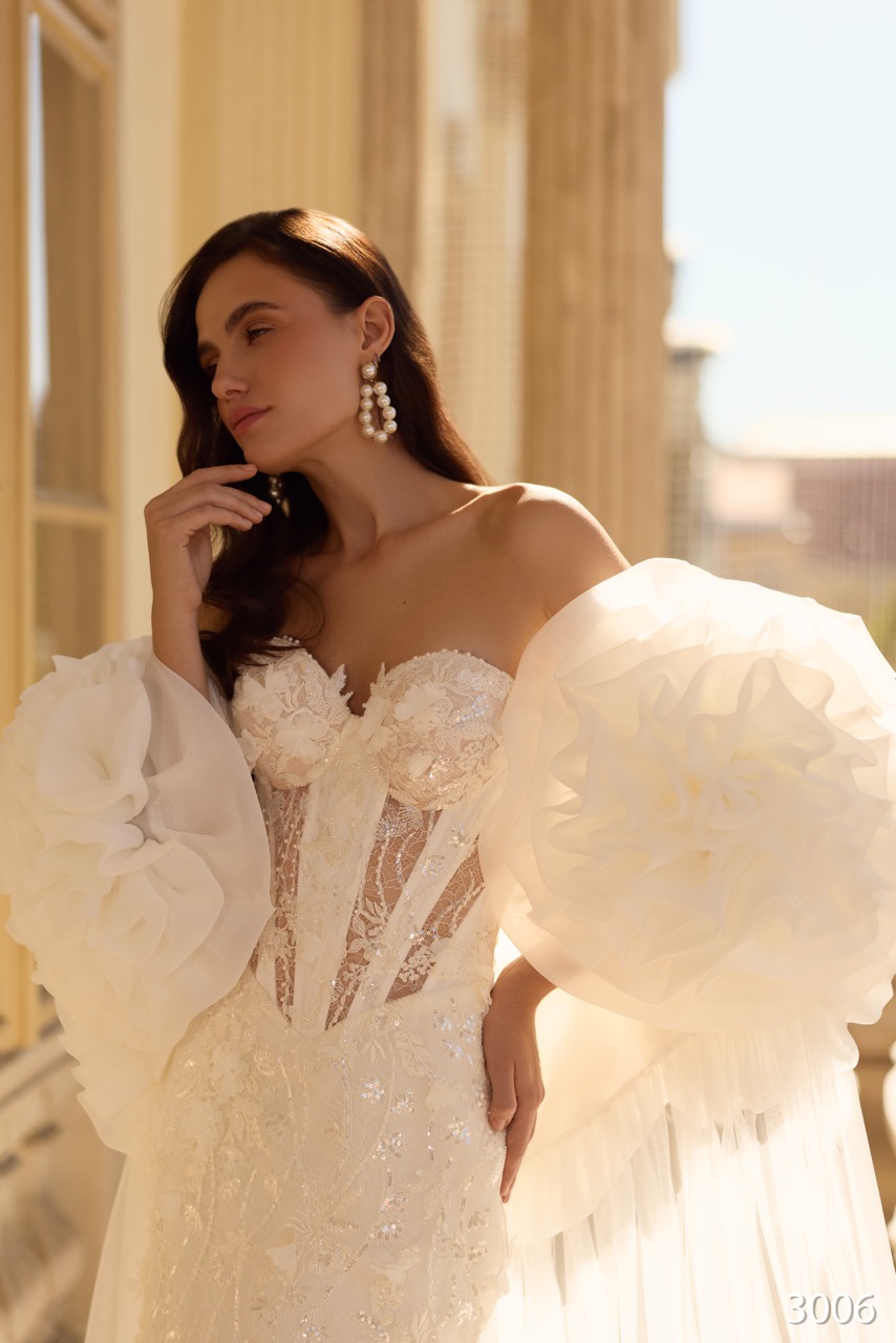 Este deslumbrante vestido de corte sereia destaca-se pelo seu design luxuoso e dramático, apresentando um corpete espartilhado translúcido com aplicações florais em relevo. O visual é elevado por mangas abaloadas volumosas e uma cauda etérea em tule, criando uma silhueta escultural que combina a alta-costura moderna com um romantismo sofisticado e inesquecível.