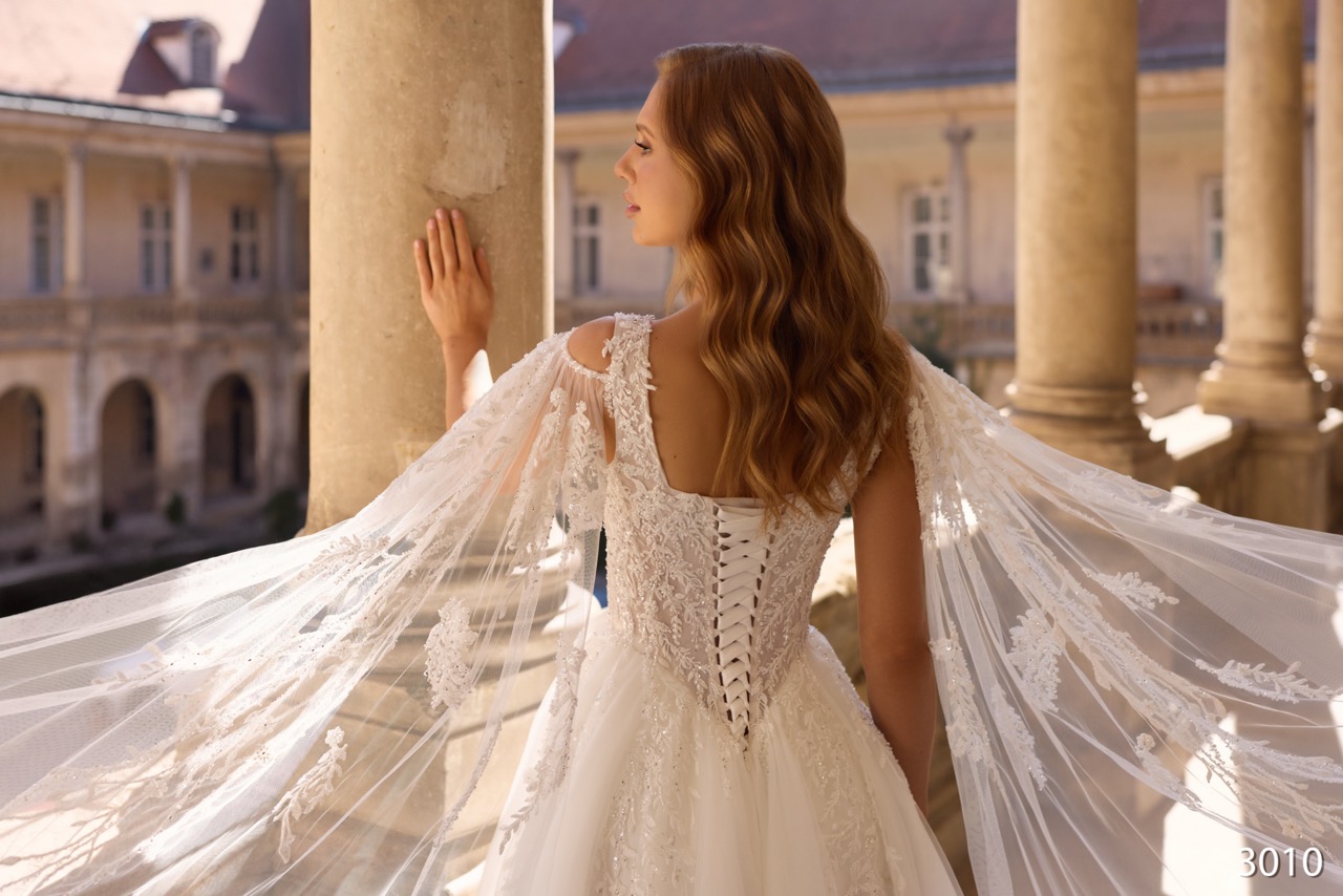 O modelo 3010 é uma peça de alta costura desenhada para a noiva que deseja um visual dramático e sofisticado. O corpete é primorosamente trabalhado com bordados de pedraria e cristais sobre um decote quadrado moderno, proporcionando um brilho luxuoso. A saia fluida em tule de seda destaca-se por uma racha lateral audaz, que confere movimento e um toque de sensualidade. O elemento diferenciador são as longas capas de tule que nascem delicadamente dos ombros, criando um efeito de “asas” etéreas que substituem o véu tradicional e garantem uma presença majestosa e inesquecível.