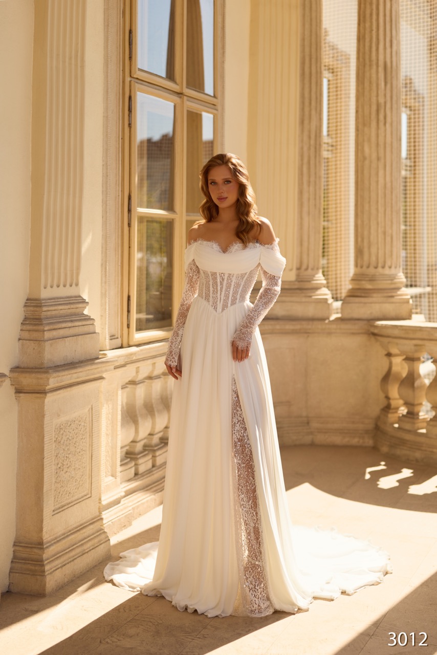 O modelo 3012 é a escolha perfeita para a noiva que procura um equilíbrio entre a sedução moderna e o romantismo clássico. O corpete estruturado, com barbas de baleia visíveis, define a silhueta de forma impecável, enquanto o decote “ombro a ombro” com acabamento em renda delicada emoldura o colo com suavidade. A saia de corte limpo e fluido é interrompida por uma racha lateral dramática, que revela uma subcamada de renda trabalhada, adicionando um detalhe surpreendente e luxuoso a cada passo.