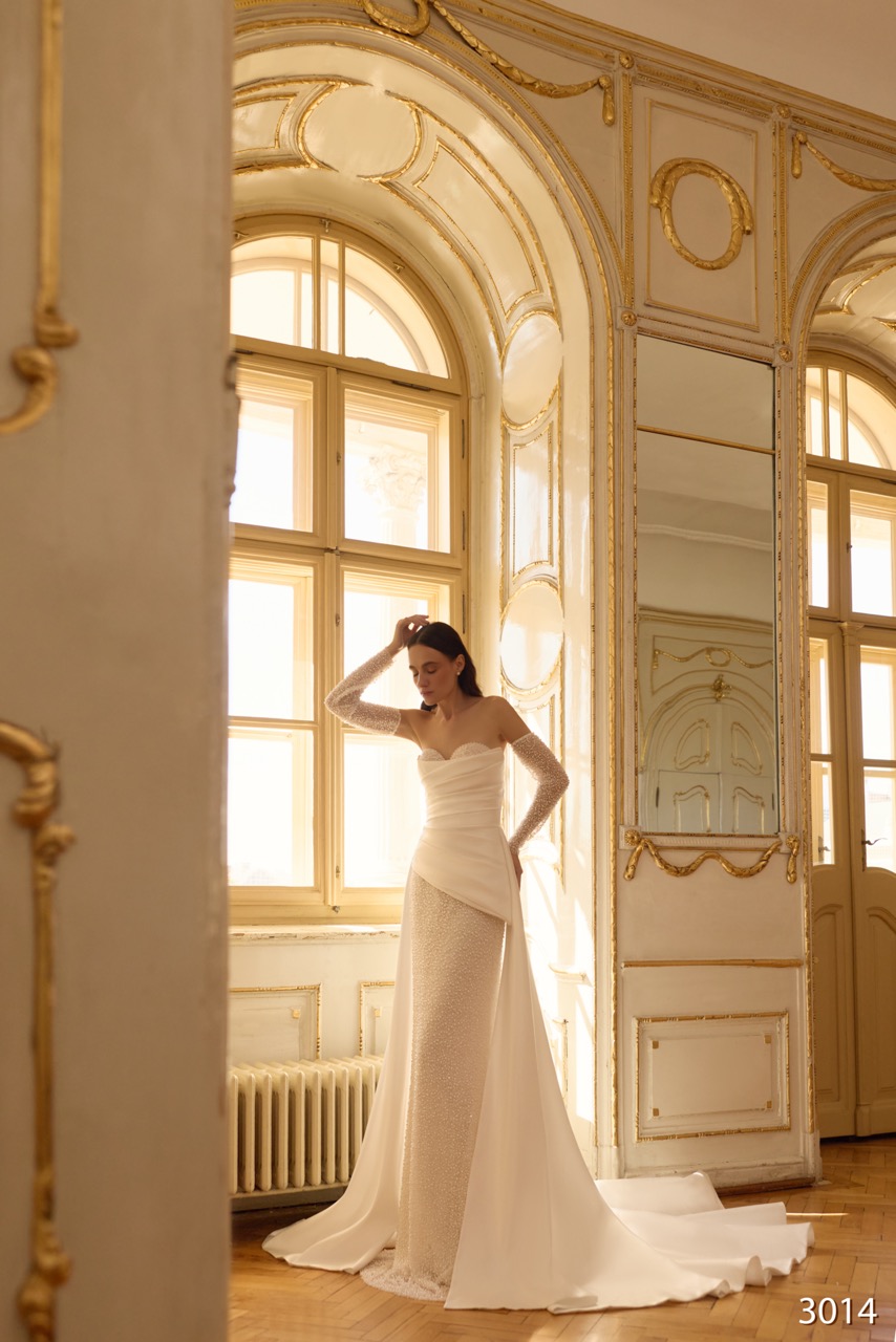 O modelo 3014 é uma obra-prima de design que celebra a forma feminina com um toque de drama arquitetónico. A base do vestido é confecionada numa renda delicada que envolve o corpo, apresentando um corpete drapeado com decote de ombro caído e mangas longas transparentes. O elemento de destaque é a luxuosa sobrecamada em cetim que nasce da anca, criando um volume assimétrico e uma cauda majestosa que contrasta com a textura da renda. É a escolha ideal para a noiva que procura um visual clássico reinterpretado com modernidade e luxo.