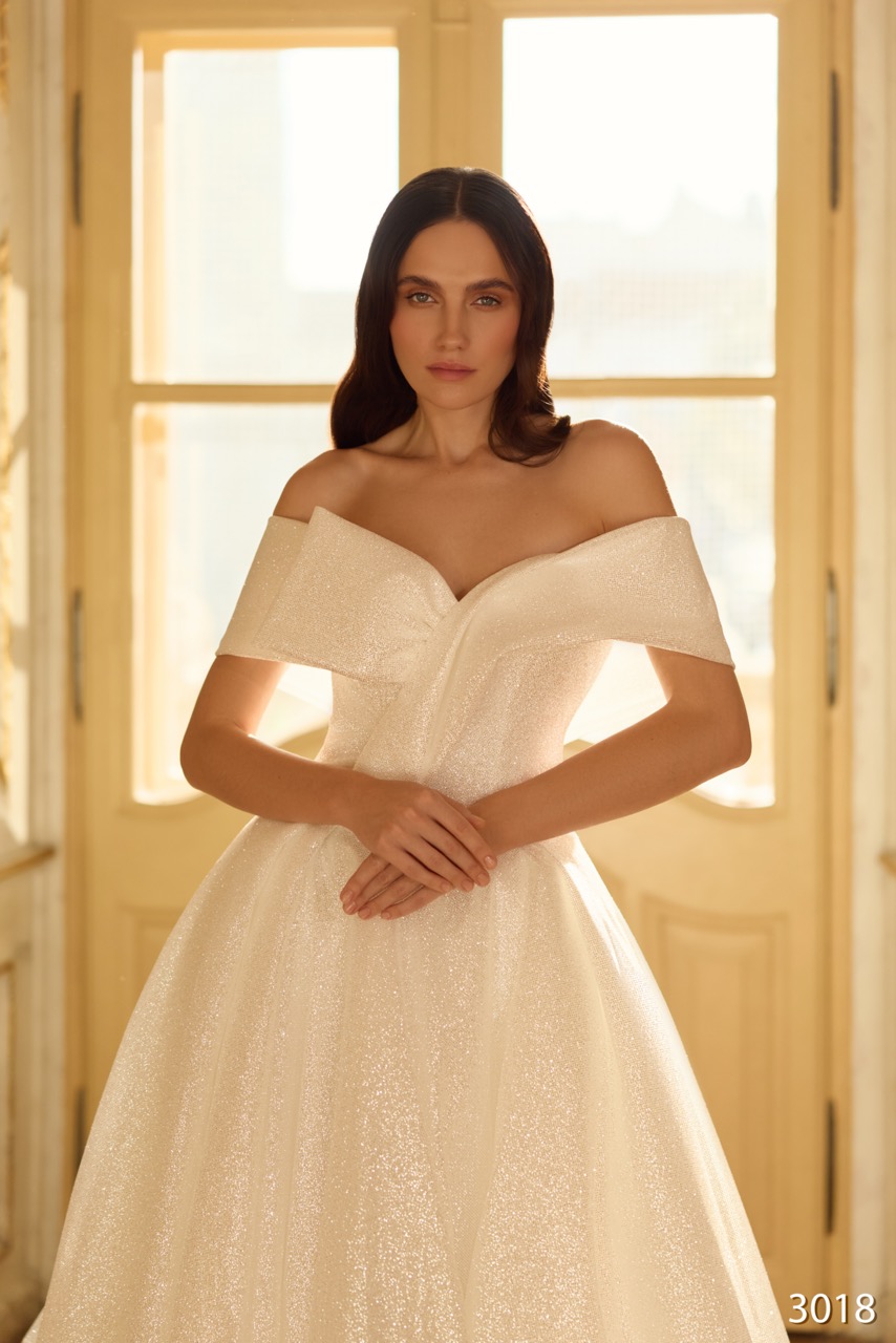 O modelo 3018 é a escolha definitiva para a noiva que deseja ser o centro de todas as atenções sob as luzes da celebração. Este vestido de corte princesa é inteiramente confecionado num tecido cintilante que reflete a luz de forma espetacular a cada movimento. O corpete estruturado apresenta um decote “off-the-shoulder” com um drapeado artístico que suaviza a linha do busto e dos ombros. A saia volumosa e luxuosa surpreende com uma racha lateral profunda, conferindo uma dose de modernidade e audácia a uma silhueta tradicionalmente clássica.