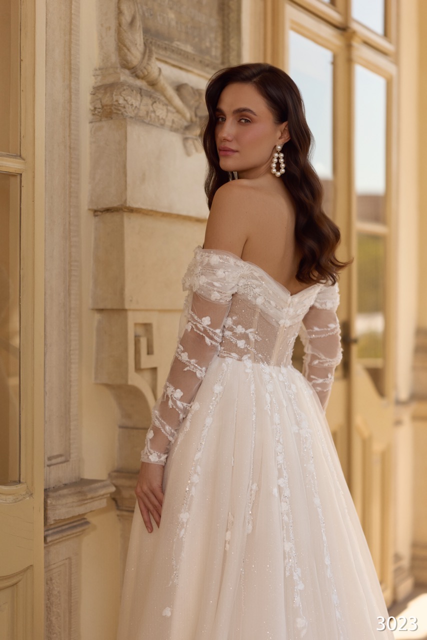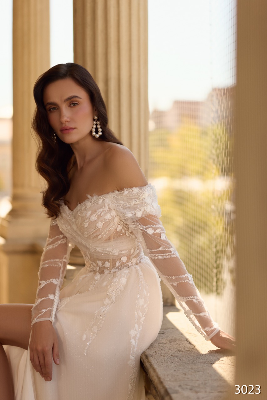 O modelo 3023 é a escolha ideal para noivas que procuram uma estética etérea e graciosa. O corpete é delicadamente trabalhado com aplicações de renda floral que se estendem pelos braços no decote “off-the-shoulder”, criando um visual suave e feminino. A saia em tule de seda leve apresenta uma racha lateral audaz, que proporciona um movimento magnífico ao caminhar e revela um toque de modernidade. O equilíbrio entre o volume suave da saia e o detalhe artesanal do corpete torna esta peça perfeita para cerimónias ao ar livre ou destinos de verão.