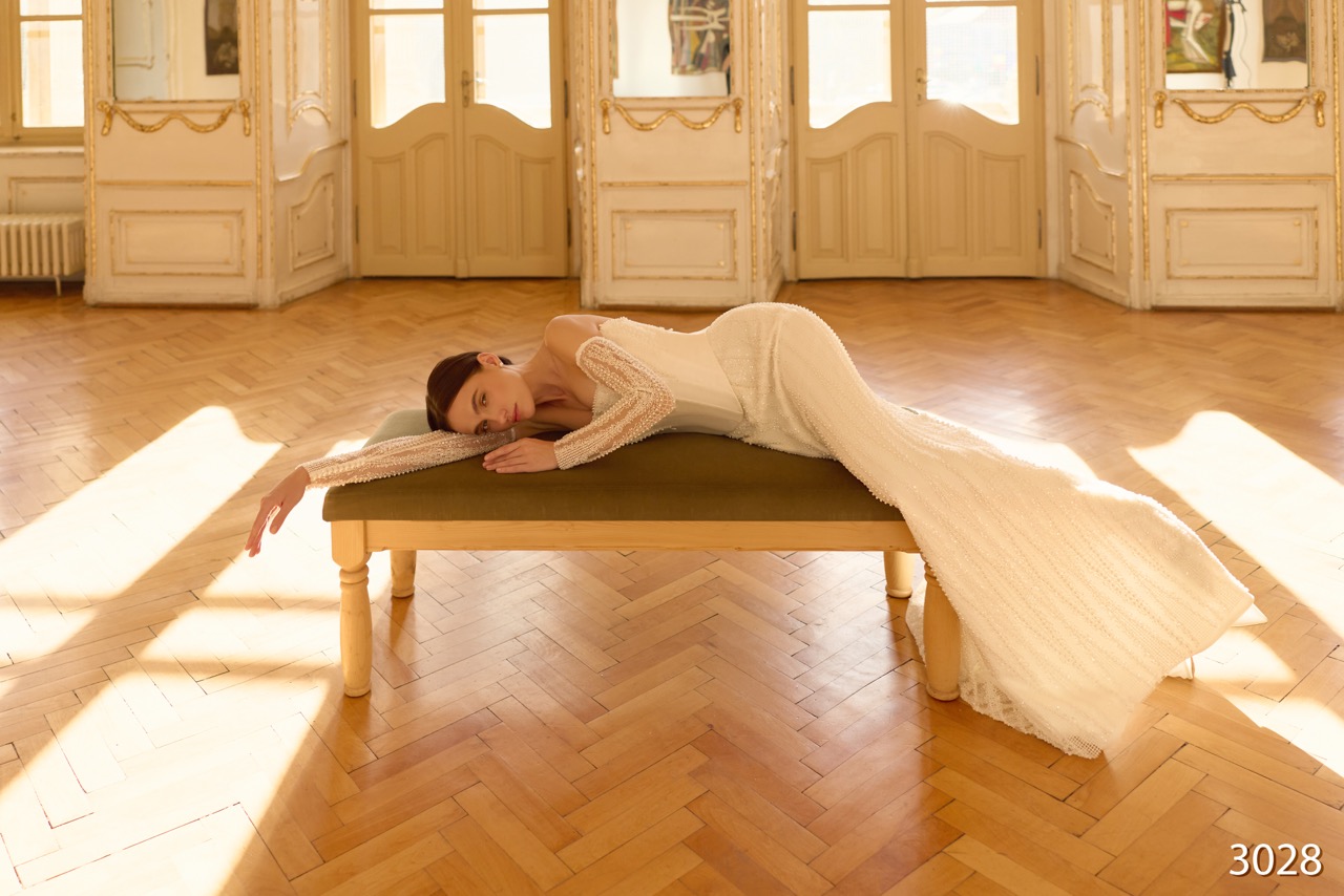 O modelo 3028 é uma verdadeira joia da alfaiataria nupcial, desenhado para a noiva que deseja uma silhueta definida com um toque de luxo artesanal. O vestido de corte sereia destaca-se pelo seu corpete meticulosamente drapeado e decote “ombro a ombro” que emoldura o colo com suavidade. Toda a extensão da peça é adornada com padrões lineares de micro-pérolas e cristais, criando um efeito de brilho sofisticado e uma textura multidimensional que flui até à elegante cauda. As mangas compridas e transparentes, também trabalhadas, completam este visual de puro glamour e distinção.