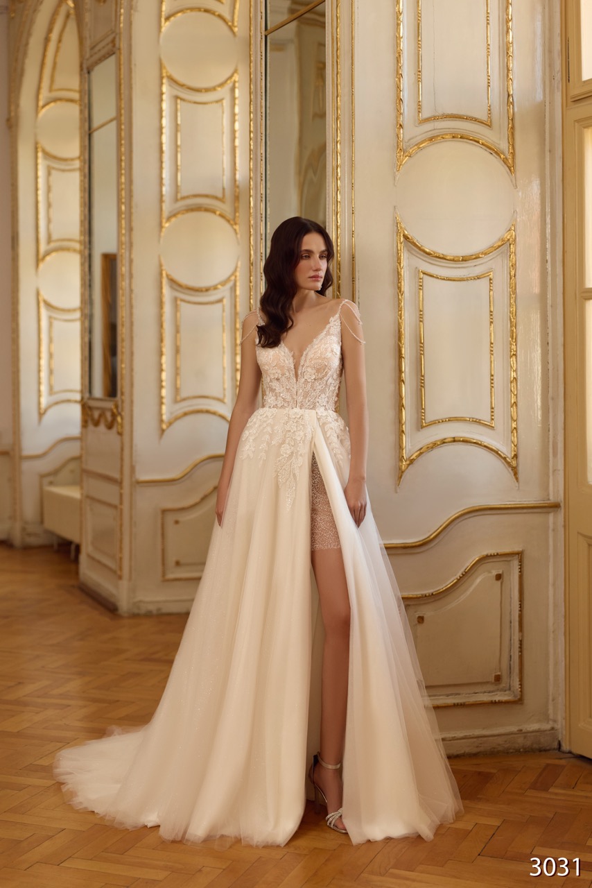 O modelo 3031 é a escolha perfeita para a noiva que procura um visual delicado com um toque de audácia. O corpete apresenta um decote em “V” profundo, sustentado por alças finas adornadas com pormenores de brilho, e é inteiramente revestido por aplicações de renda botânica que se fundem suavemente com a saia. A saia em tule de seda, leve e volumosa, destaca-se por uma racha frontal alta, permitindo o vislumbre de uma camada inferior de renda trabalhada e conferindo um movimento gracioso e moderno à silhueta.