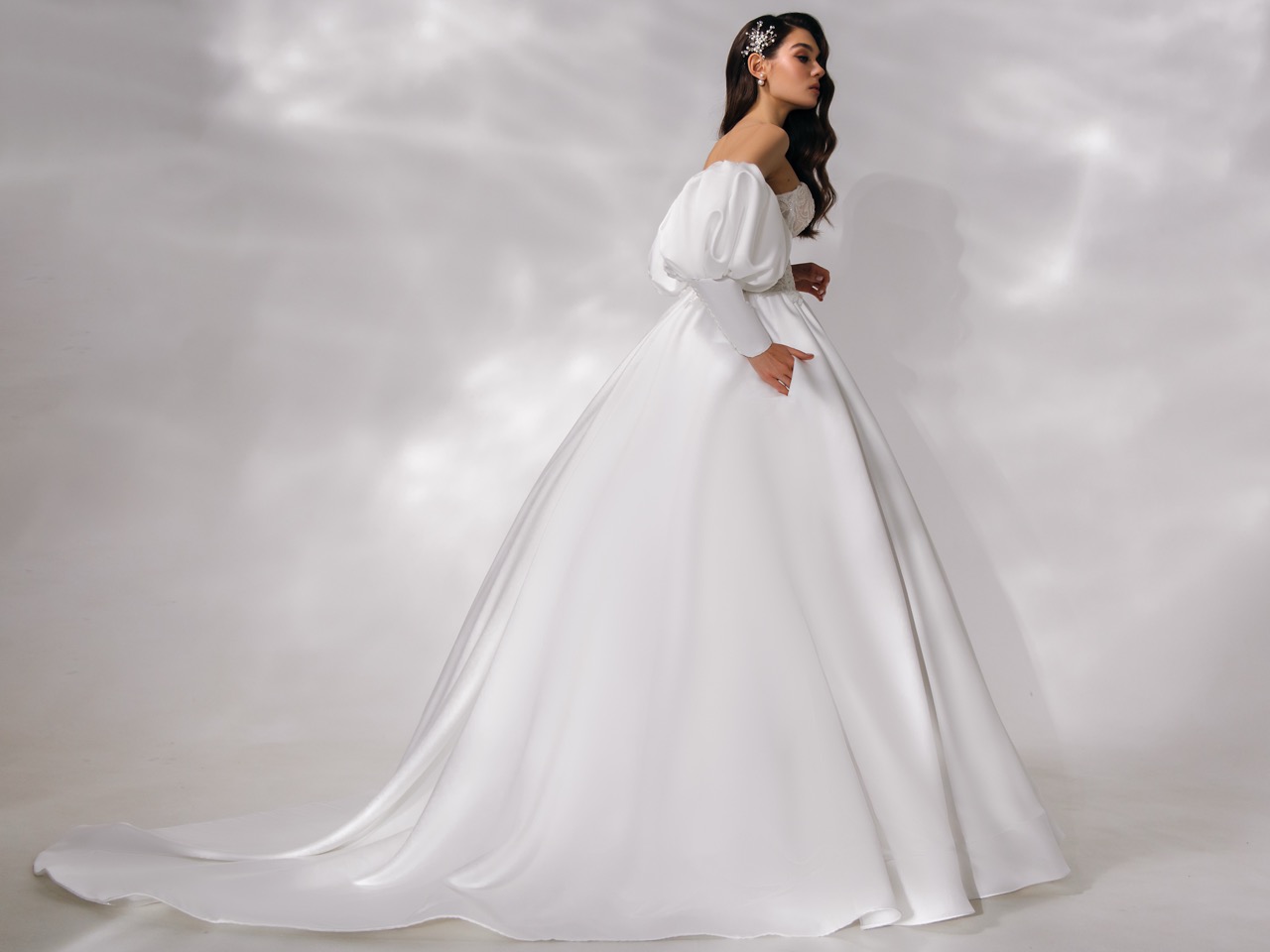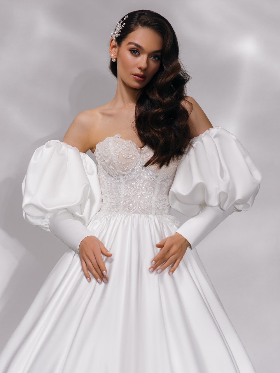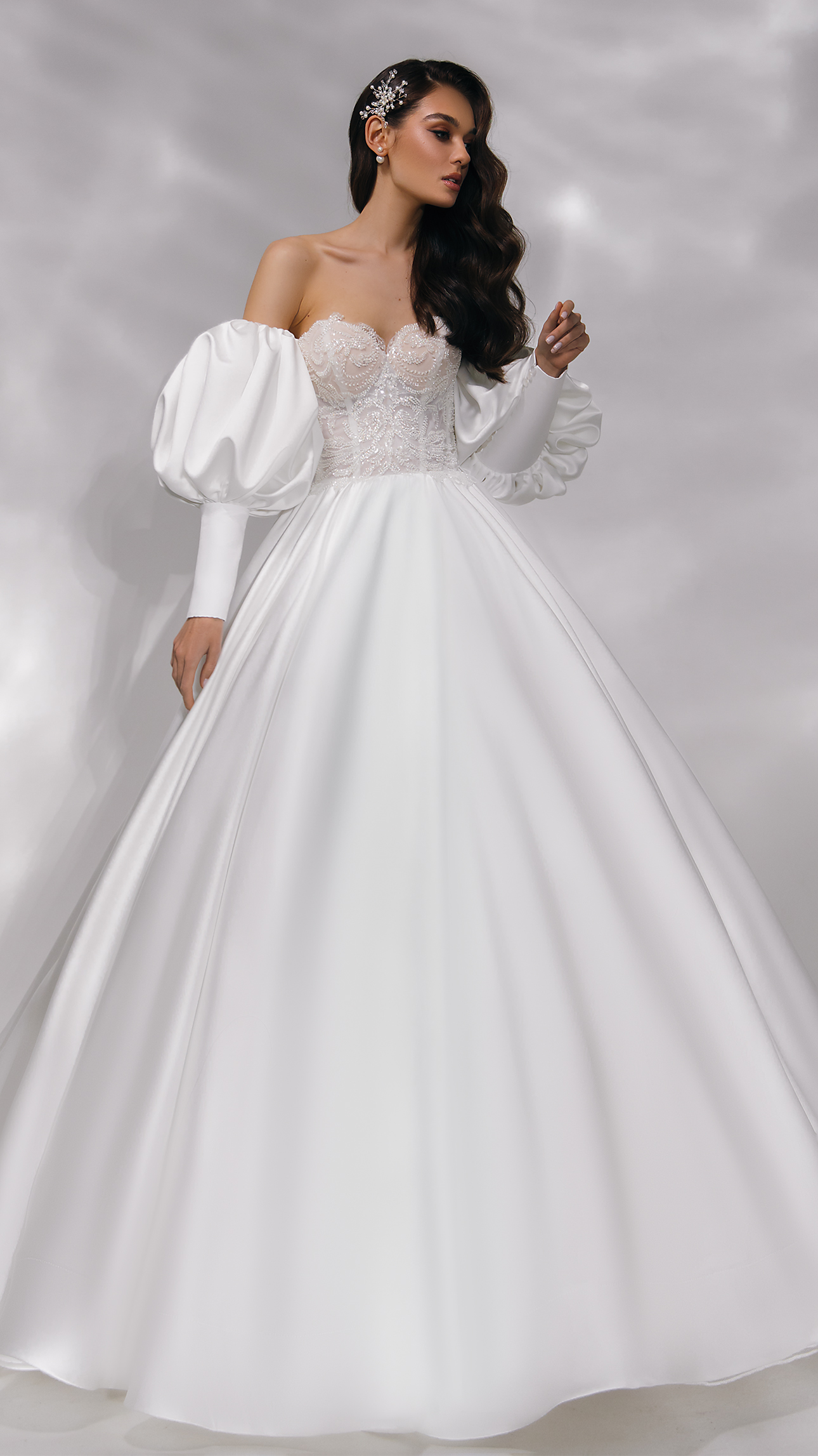 Um design que combina o romantismo de época com a moda contemporânea. O corpete estruturado, com um romântico decote coração, é inteiramente revestido por uma renda intrincada e brilhante que captura a luz de forma sublime. O destaque absoluto vai para as mangas bufantes removíveis, com punhos ajustados, que conferem um dramatismo elegante e versátil ao conjunto. A saia ampla e lisa flui majestosamente, criando uma silhueta de baile perfeita para uma noiva que deseja uma presença marcante e memorável.