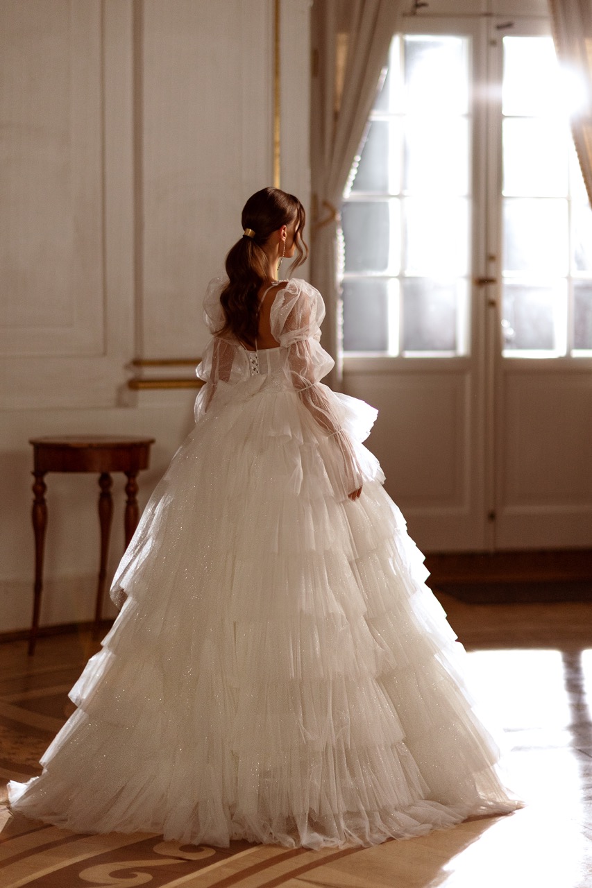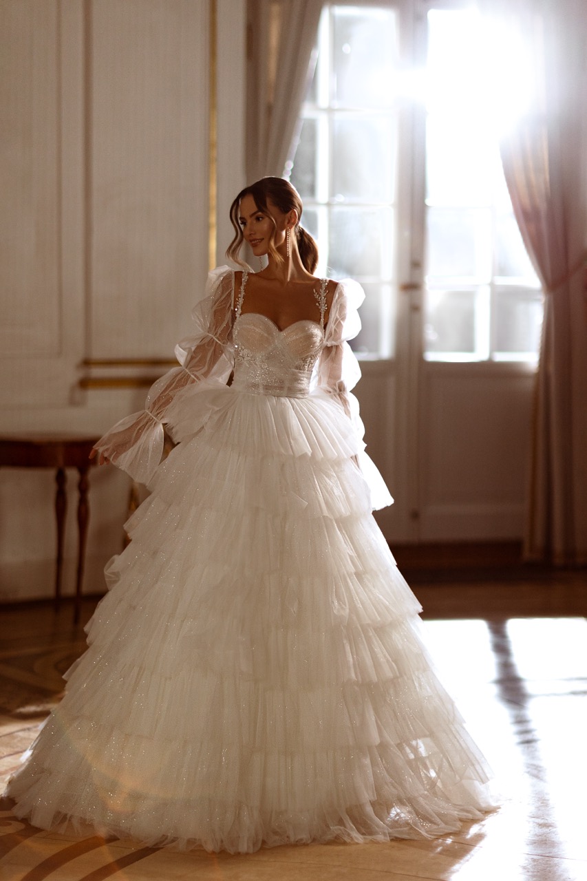 Este modelo personifica a doçura e a elegância clássica. Destaca-se pelo decote quadrado e mangas balão removíveis, que conferem um ar etéreo e romântico à noiva. O corpete é trabalhado com rendas florais finas que se estendem subtilmente para a saia, enquanto a parte inferior em tule leve cria uma silhueta A-line suave e graciosa. É a escolha perfeita para noivas que procuram um visual de “fada”, combinando delicadeza, movimento e um toque atemporal.