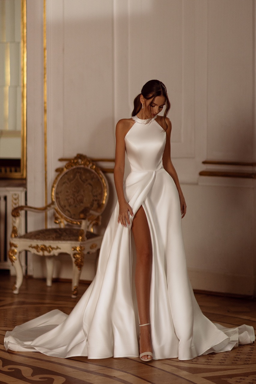 Este modelo é a escolha ideal para noivas que pretendem realçar a sua silhueta com sofisticação. Com um corte A-LINE que abraça as curvas, o vestido destaca-se pelo corpete simples e com detalhes perto do pescoço criando uma ilusão de “colar”. A rendaÉ um design que combina sensualidade moderna com o romantismo clássico.