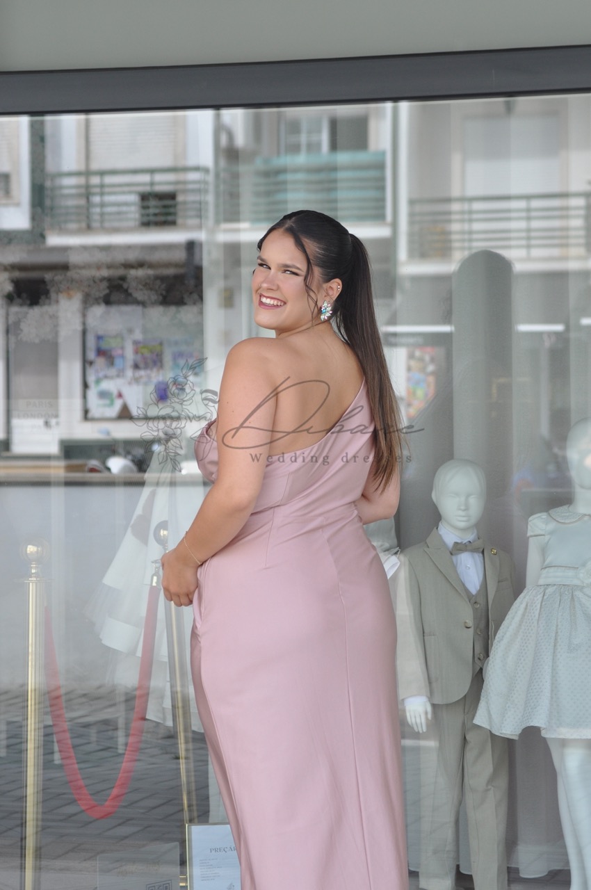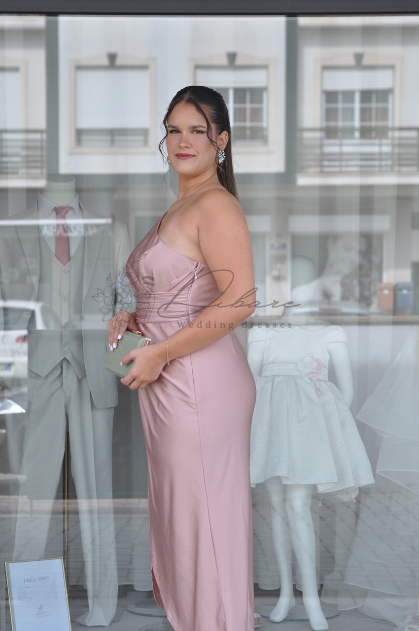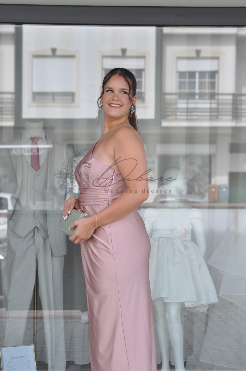 Eleve o seu estilo em ocasiões especiais com este exuberante vestido midi num sofisticado tom de Rosa. Perfeito para casamentos, batizados ou eventos semiformal, este modelo combina elegância contemporânea com detalhes lisonjeiros. O design destaca-se pelo seu moderno e sensual decote de um ombro só, que confere um toque assimétrico e muito atual. O tecido apresenta um draperiado (ou pregas) intrincado e estratégico que envolve o corpo, criando uma textura rica e definindo a silhueta de forma impecável. Este efeito drapeado é particularmente eficaz para realçar a cintura e disfarçar áreas com delicadeza. O comprimento midi, que termina abaixo do joelho, confere um ar de requinte e formalidade. A saia possui um design de sobreposição ou uma abertura sutil (fenda) na parte frontal, adicionando movimento e um toque final de feminilidade.
