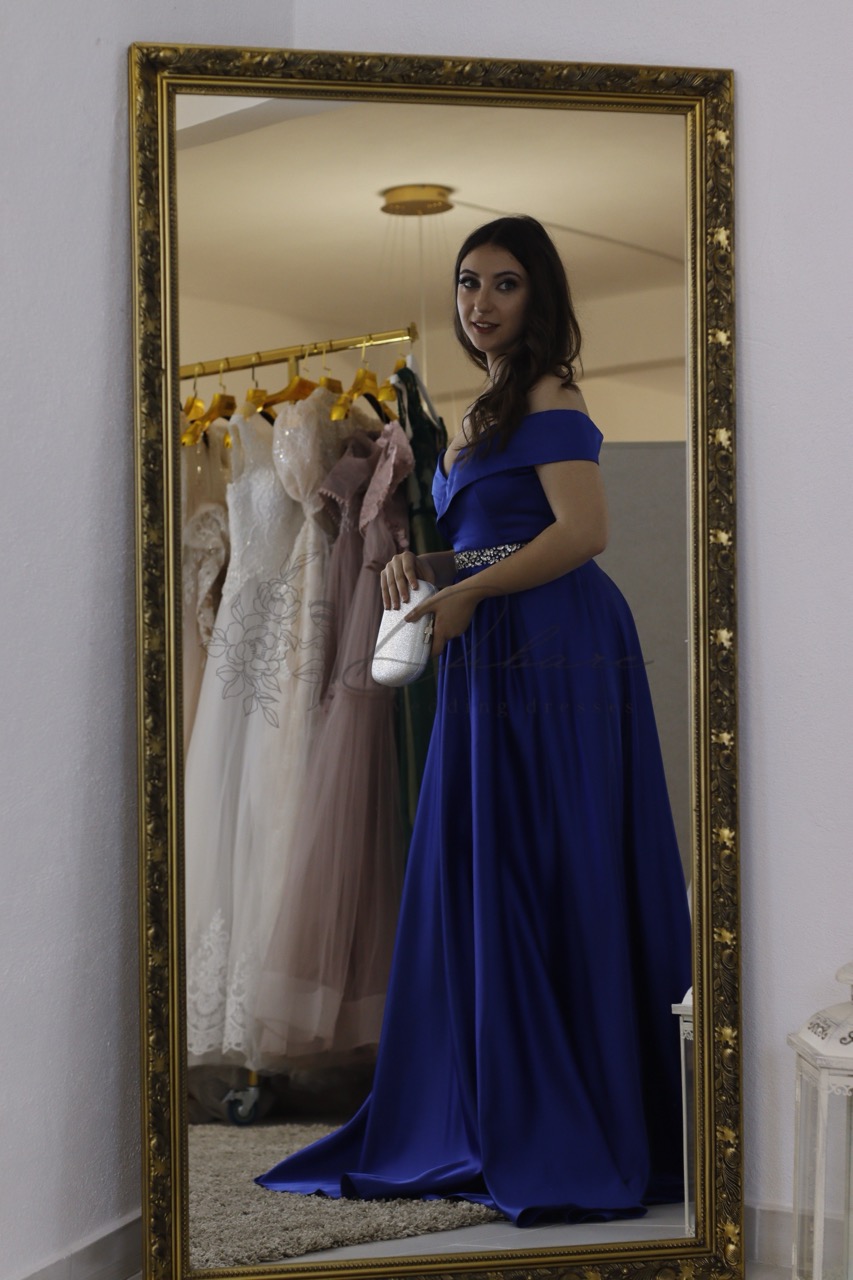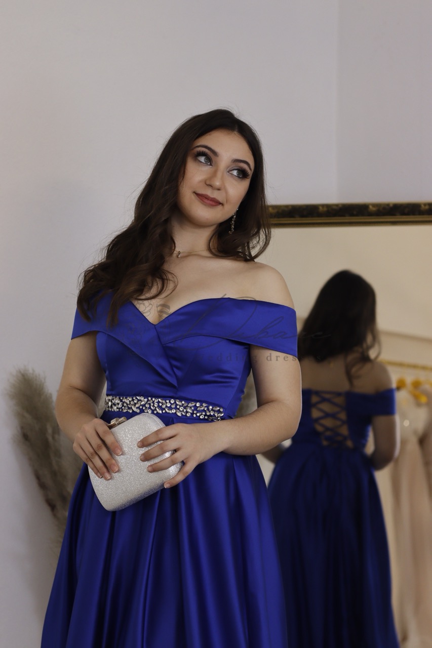 Entre no universo da elegância e sofisticação com este deslumbrante vestido de gala longo, na vibrante e intemporal cor Azul. Concebido para impressionar, este modelo capta a atenção com a sua silhueta clássica e detalhes modernos, sendo a escolha perfeita para eventos de gala, casamentos, formaturas ou festas de grande destaque. O ponto focal do design é o seu charmoso decote Bardot (ombros à mostra), que realça a clavícula e o pescoço com uma sensualidade elegante e discreta. As mangas curtas que caem graciosamente sobre os braços complementam este estilo romântico e sofisticado. Confeccionado num tecido de seda ou cetim de alta qualidade, o vestido garante um caimento estruturado e um brilho luxuoso que se move lindamente a cada passo. A cintura é marcada por um elegante cinto de cristais ou pedraria prateada, que confere um toque de glamour cintilante, definindo a figura e criando um visual equilibrado. A saia, de corte A, é volumosa e fluida, prometendo um movimento espetacular e uma presença memorável em qualquer pista de dança.