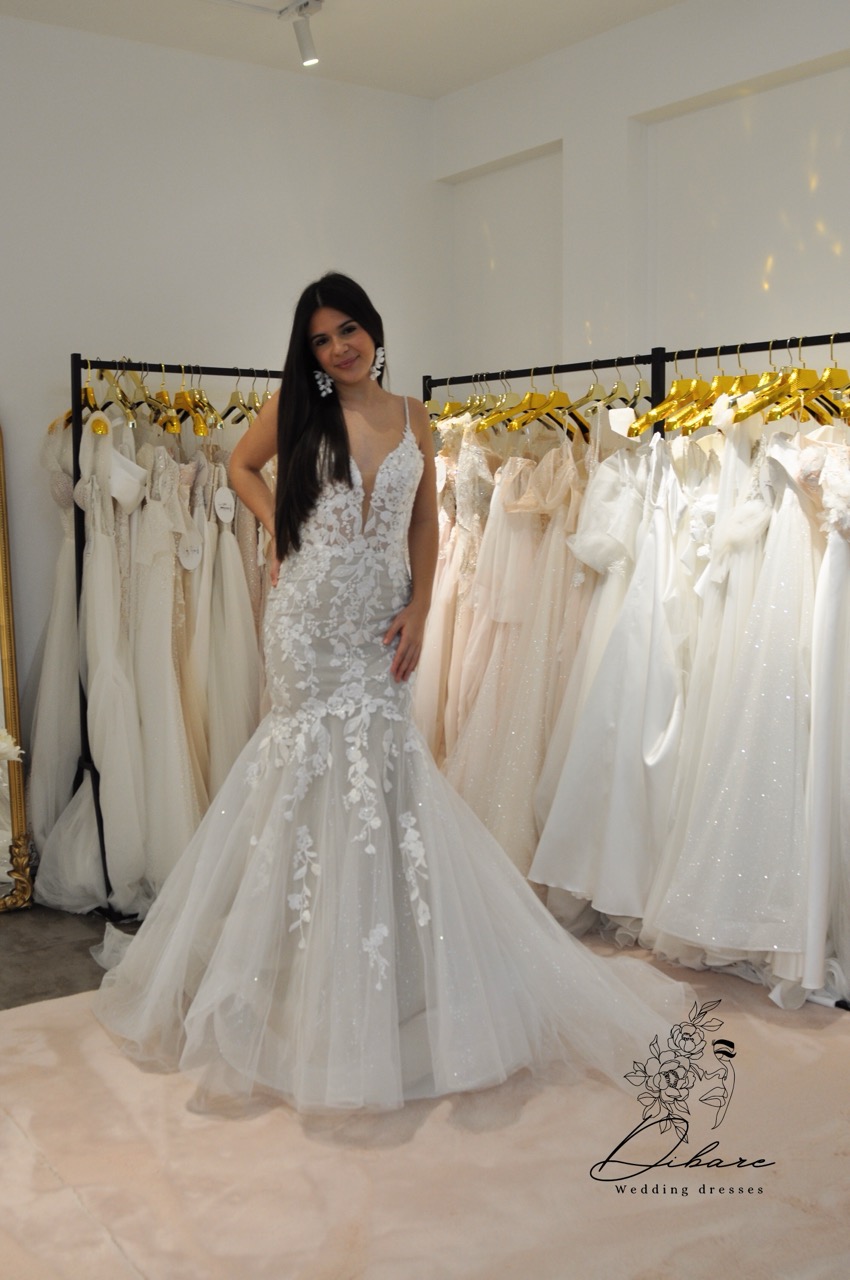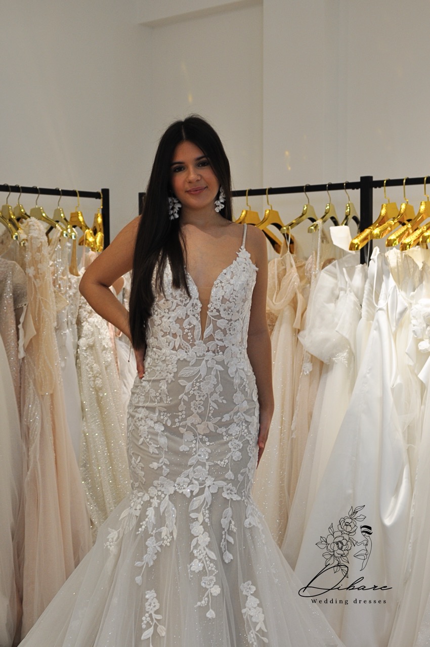 Este vestido de noiva é a personificação do glamour de alta-costura, desenhado meticulosamente para a noiva que deseja uma silhueta dramática e inesquecível. Com um corte sereia deslumbrante, a peça abraça as curvas de forma elegante antes de se abrir numa saia volumosa e etérea, criando um movimento fluido e majestoso a cada passo em direção ao altar. O corpo do vestido é uma verdadeira obra de arte, apresentando um decote em “V” profundo que alonga a silhueta, sustentado por alças delicadas que conferem leveza ao visual. Todo o modelo é ricamente trabalhado com aplicações de renda floral em relevo e bordados intrincados, que se fundem com o tule de base para um efeito de transparência sofisticada e romântica.