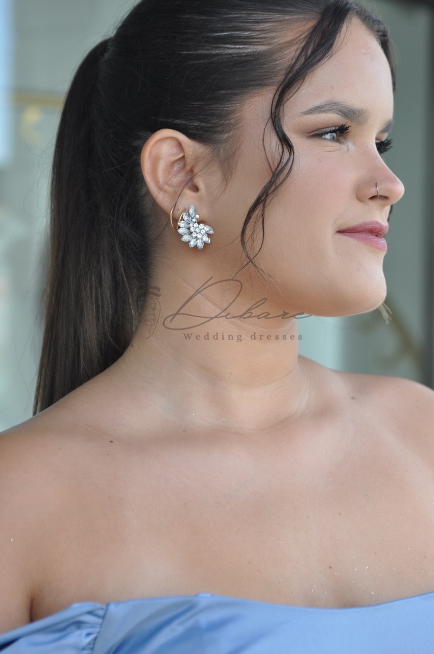 Com um acabamento prateado polido, este brinco é extremamente versátil, sendo o complemento ideal tanto para vestidos de gala quanto para produções de cerimónia mais minimalistas.