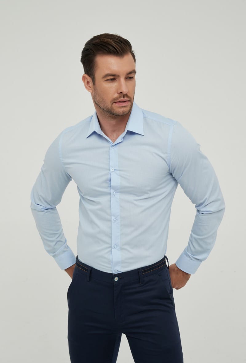 A sua tonalidade azul suave é extremamente fácil de combinar, harmonizando perfeitamente com calças de alfaiataria escuras, como o azul-marinho ou cinza. É uma peça intemporal que une a funcionalidade do dia a dia ao rigor da camisa clássica.