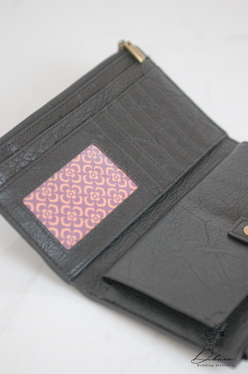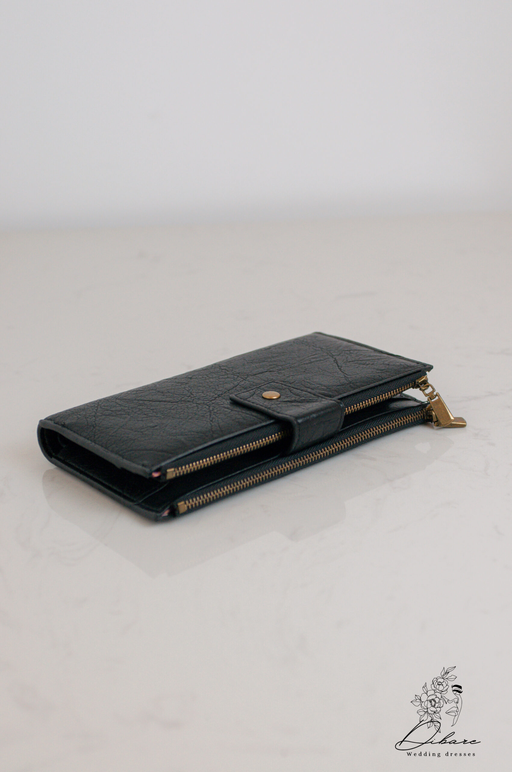 Apresentamos uma carteira alongada que combina sofisticação atemporal com funcionalidade moderna, perfeita para quem valoriza a organização e o estilo. Confeccionada em material de alta qualidade com um acabamento levemente texturizado (possivelmente em pele sintética ou genuína), esta peça irradia uma elegância discreta. A cor é um tom escuro e profundo — possivelmente preto ou um azul-marinho muito escuro — conferindo-lhe uma versatilidade ímpar, fácil de coordenar com qualquer look ou mala. O design é prático, com um formato retangular alongado, ideal para guardar notas sem dobrar e múltiplos cartões. Destaca-se o fecho de aba com um pequeno botão de pressão dourado que não só garante a segurança dos seus pertences, mas também adiciona um toque subtil de glamour.