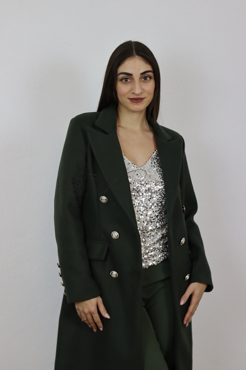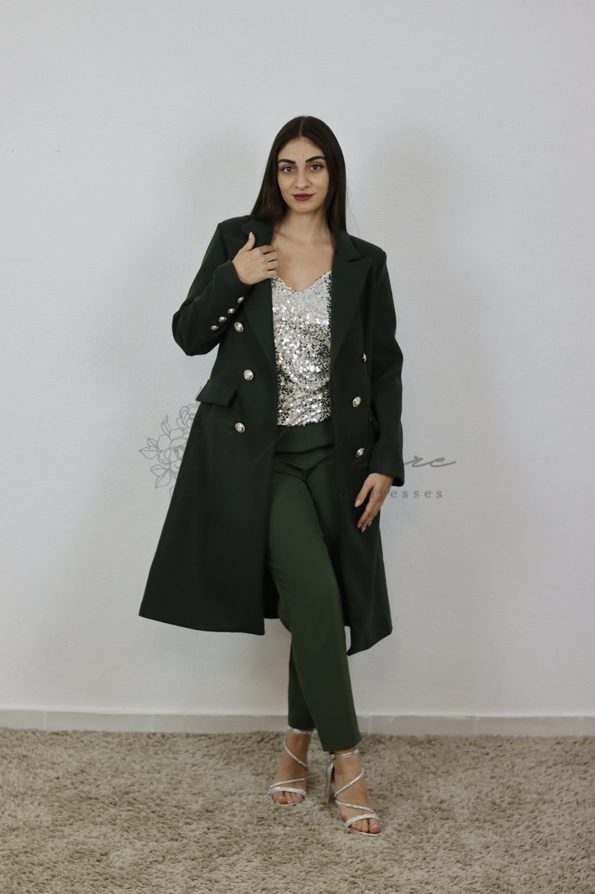 Abrace o estilo com este casaco comprido, estruturado e chique, em tom verde garrafa profundo. Este agasalho é a definição de sofisticação moderna, com um design de inspiração militar que o torna numa peça de destaque essencial para o seu guarda-roupa de outono/inverno. O casaco apresenta uma clássica abotoadura dupla, realçada por botões metálicos em relevo de cor prateada/dourada, que adicionam um toque de requinte. Possui lapelas de corte notch e um corte direito que confere uma silhueta alongada e elegante. O tecido tem um acabamento polido, e o comprimento, que desce até meio da coxa ou abaixo do joelho, garante tanto calor como impacto visual.