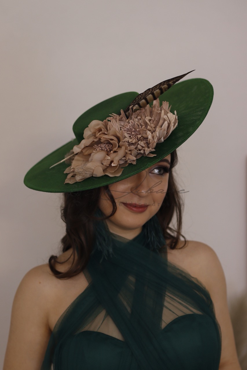 Este chapéu de cerimónia em tom verde esmeralda é a definição de distinção e audácia elegante. Com uma silhueta assimétrica e inclinada, esta peça foi desenhada para criar um perfil dramático e sofisticado, tornando-se o foco central de qualquer conjunto de alta gala ou eventos sazonais. O design destaca-se pela sua decoração rica e textural, apresentando um arranjo floral volumoso em tons de nude e bronze que contrasta magnificamente com a base vibrante. O toque final de exclusividade é conferido por uma pena natural de padrão estriado, que acrescenta movimento, altura e um elemento orgânico de luxo à peça.