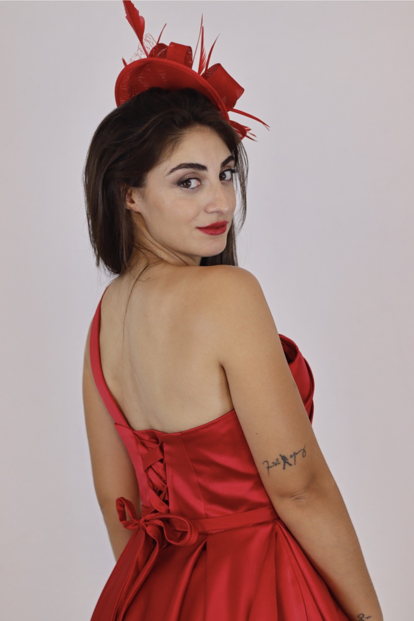 Este deslumbrante fascinator em vermelho vibrante é o acessório definitivo para quem deseja elevar o seu visual de cerimónia a um novo patamar de sofisticação. Com um design escultural e gracioso, esta peça foi pensada para mulheres que não abdicam da elegância e da exclusividade em eventos de prestígio, como casamentos e batizados.