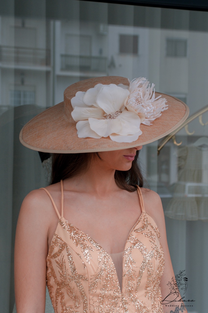 O Chapeau White é o toque final perfeito para o seu look de cerimónia. Este elegante chapéu de abas largas, em tom nude ou bege, é ricamente adornado com aplicações florais em branco e creme. Inclui bandolete para fixação versátil, permitindo posicioná-lo com sofisticação na lateral da cabeça. Ideal para casamentos, batizados e festas de jardim.
