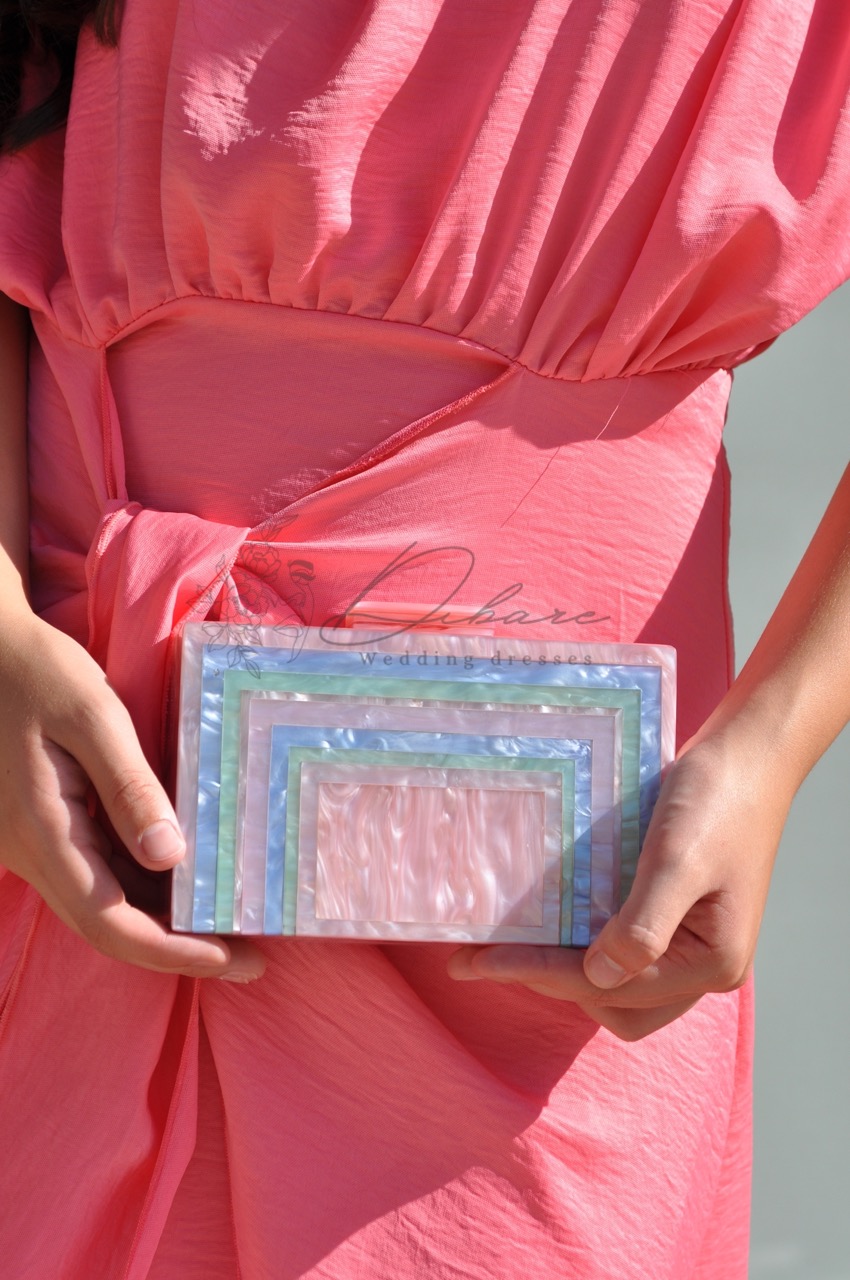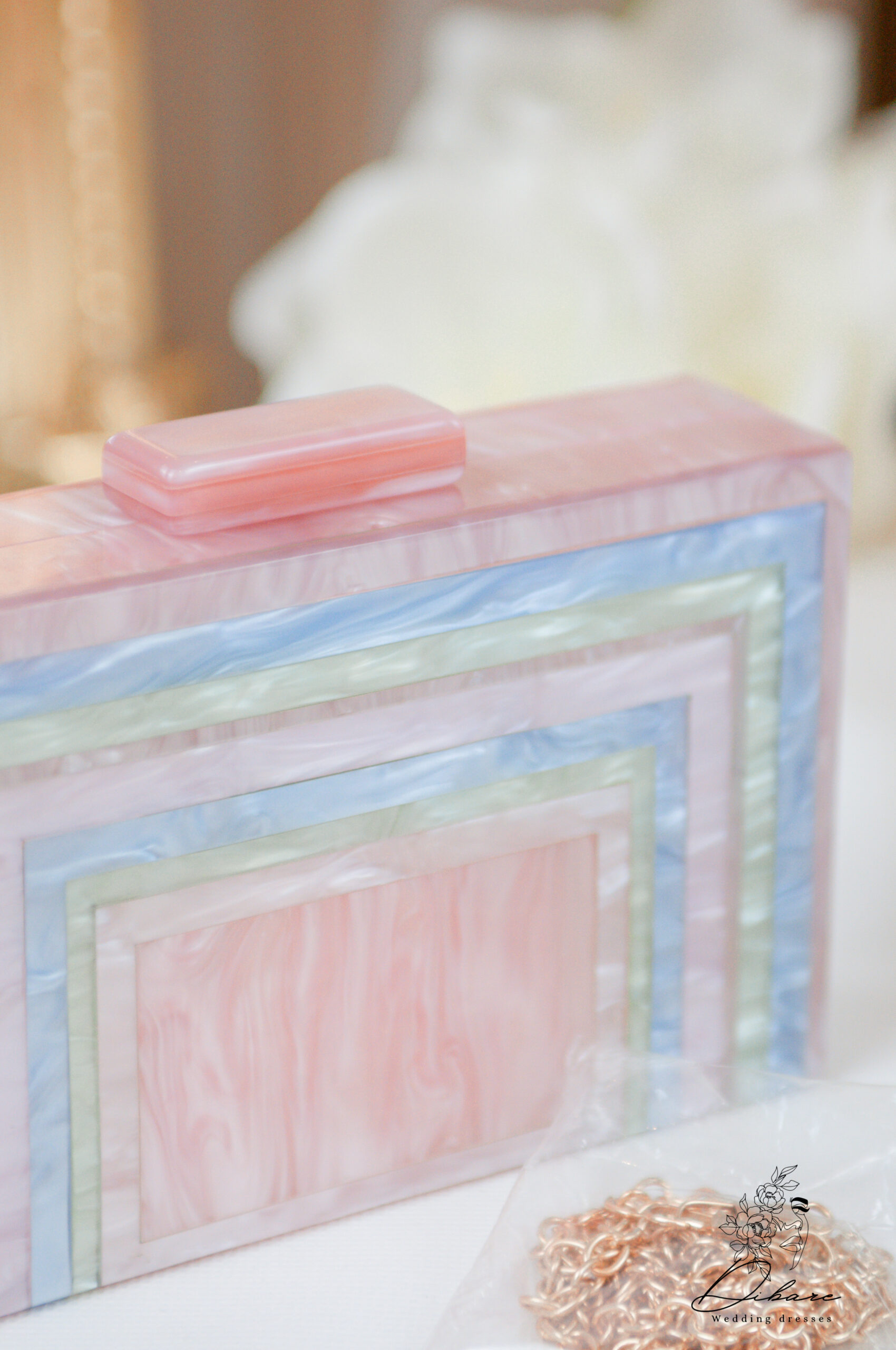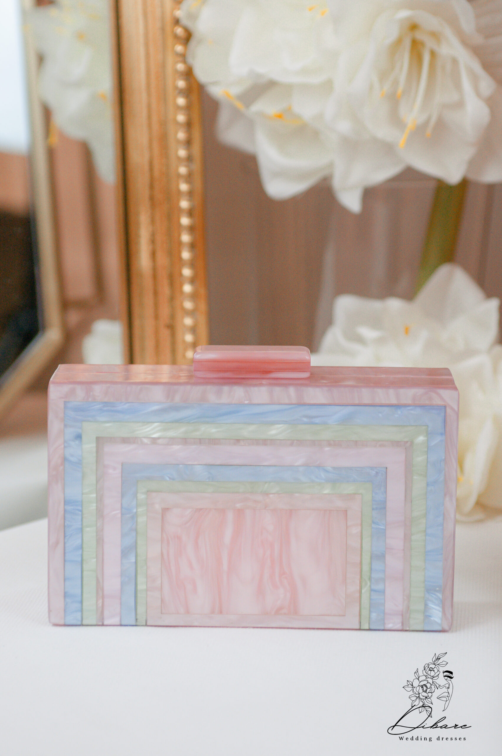 Deixe-se encantar por esta deslumbrante clutch em acrílico, uma peça de coleção que combina o charme moderno com uma paleta de cores incrivelmente suave. Ideal para a mulher que aprecia um estilo delicado, mas impactante, esta mala rígida apresenta um design geométrico e escalonado que cria um efeito visual de arco-íris pastel. As camadas de acrílico marmorizado em tons de rosa blush, azul bebé e verde menta interligam-se harmoniosamente, conferindo-lhe uma profundidade única e um brilho subtil. O seu formato retangular e a construção robusta garantem que os seus essenciais estejam seguros, enquanto o fecho superior, a condizer, assegura um toque final de sofisticação.