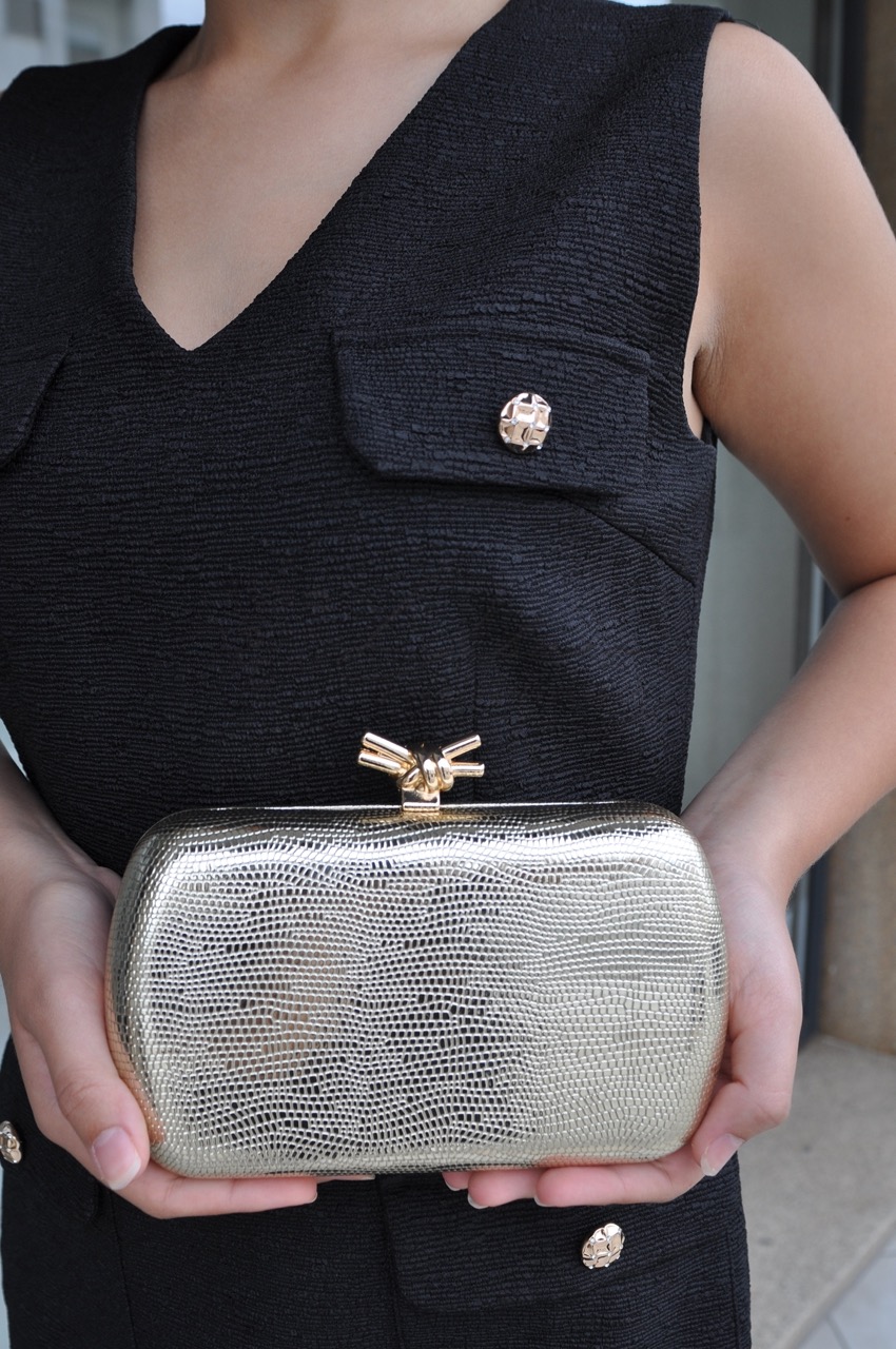 Esta elegante clutch rígida é o acessório indispensável para elevar qualquer visual de festa ou eventos formais. Com um sofisticado acabamento em tom dourado metalizado, a peça apresenta uma textura delicada que reflete a luz de forma subtil, conferindo-lhe um ar luxuoso e intemporal. O design destaca-se pelo seu fecho ornamental em forma de nó, que funciona como um ponto focal moderno e refinado. Com uma estrutura retangular de cantos suavemente arredondados, esta mala de mão oferece o equilíbrio perfeito entre o design contemporâneo e o estilo clássico. O seu tamanho compacto é ideal para transportar o essencial com máxima elegância.