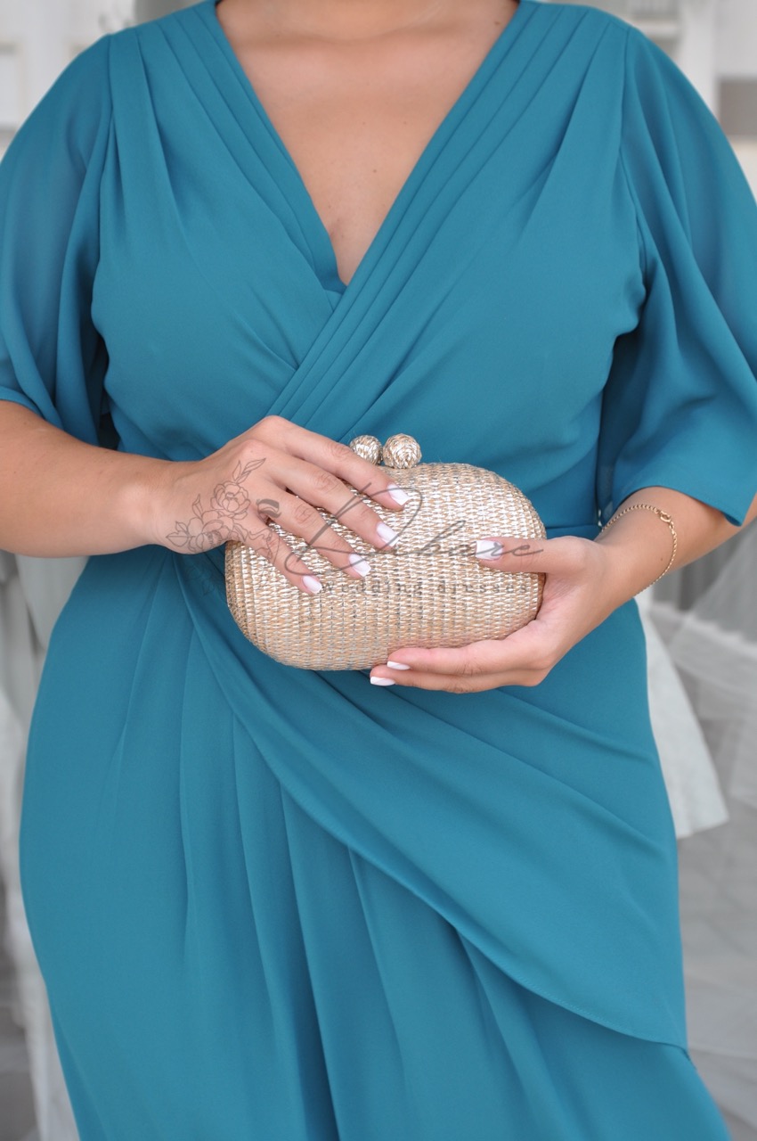 Esta sofisticada clutch rígida de formato oval é o acessório indispensável para quem procura um toque de luxo discreto e atemporal. Com um design estruturado e minimalista, a peça apresenta uma textura delicadamente entrançada num tom de dourado suave, que captura e reflete a luz de forma elegante, tornando-a ideal para eventos noturnos ou cerimónias formais. O acabamento metalizado de alta qualidade é complementado por um fecho superior decorativo com duas esferas polidas, que não só assegura a proteção dos seus objetos pessoais, como também serve como um detalhe de joalharia por si só. O seu tamanho compacto e ergonómico foi pensado para encaixar perfeitamente na mão, oferecendo conforto sem comprometer o estilo.