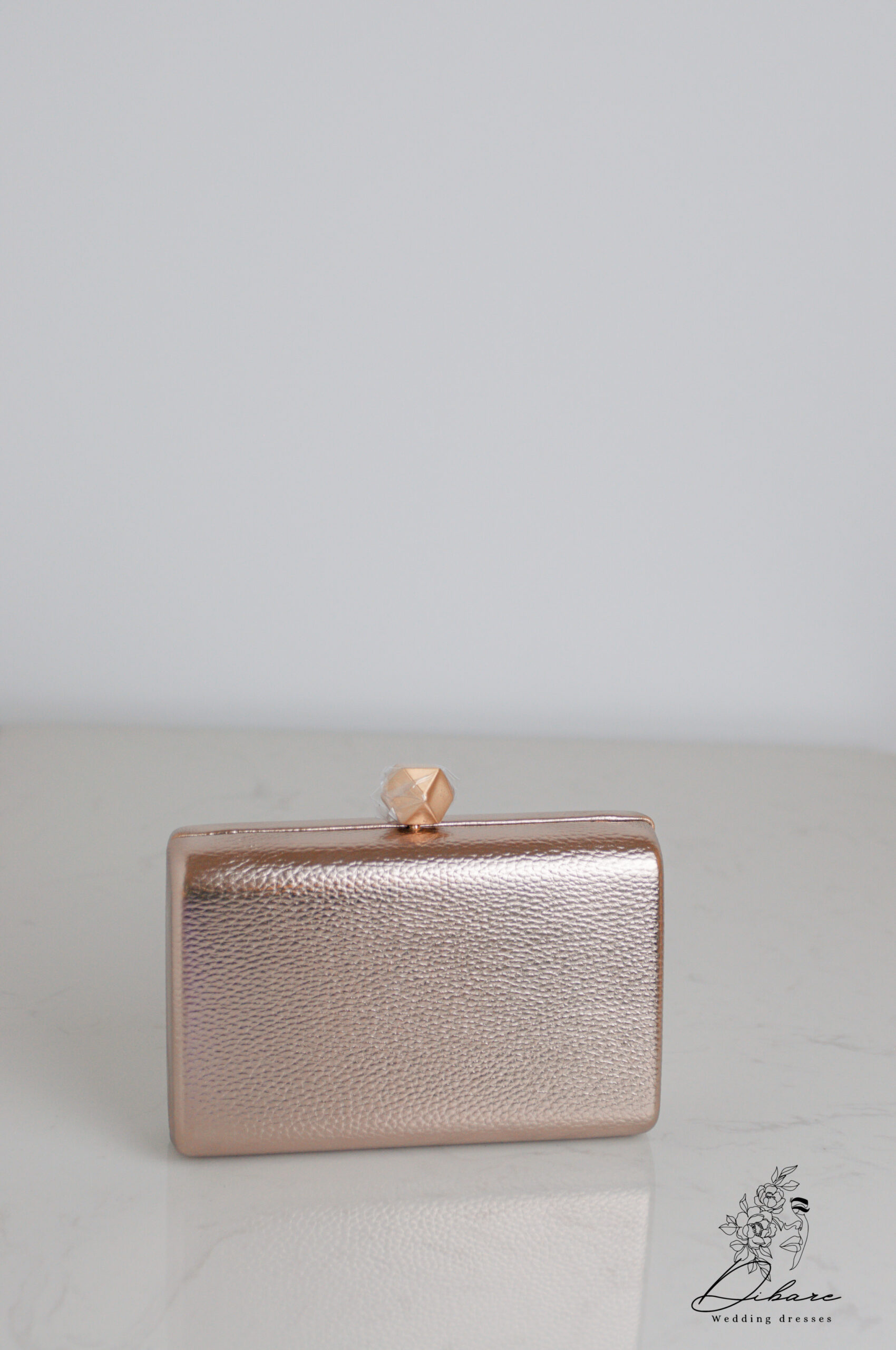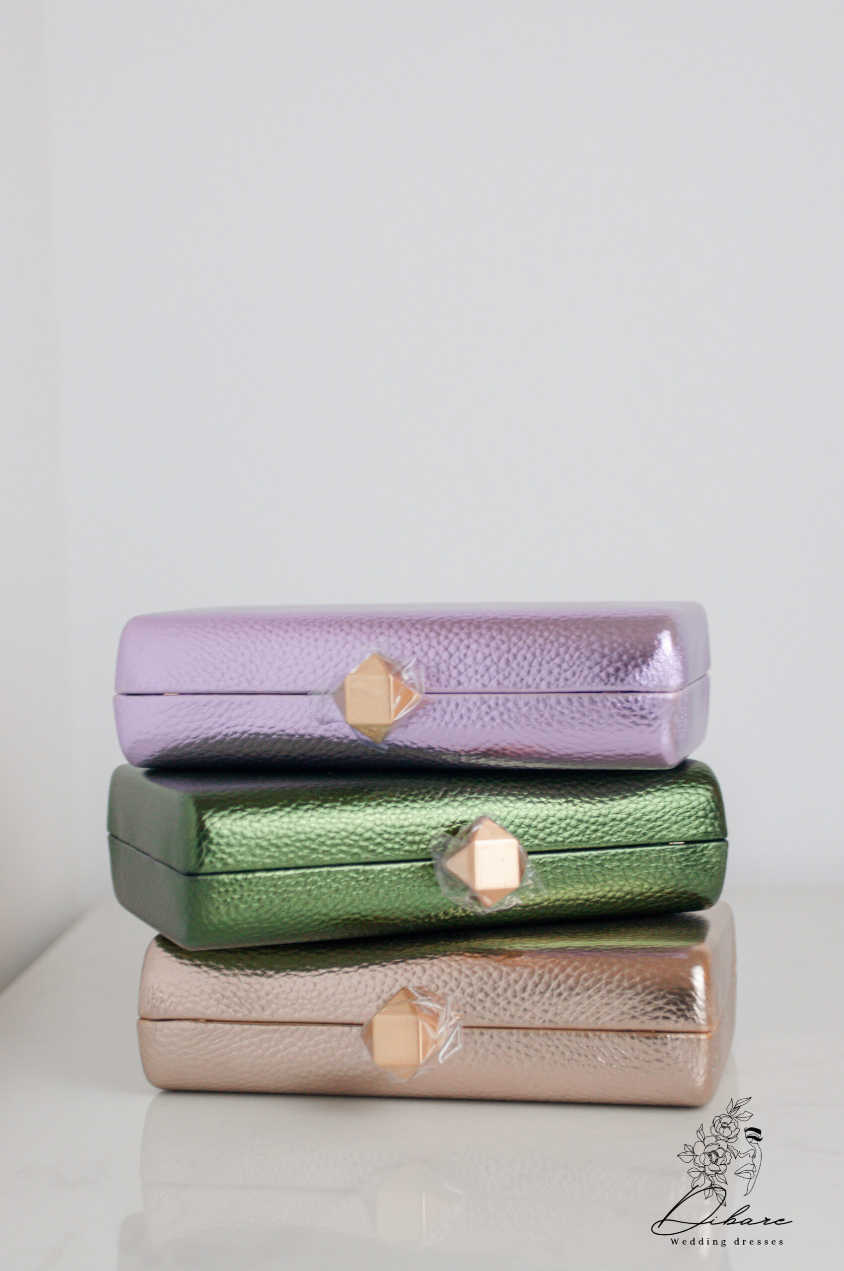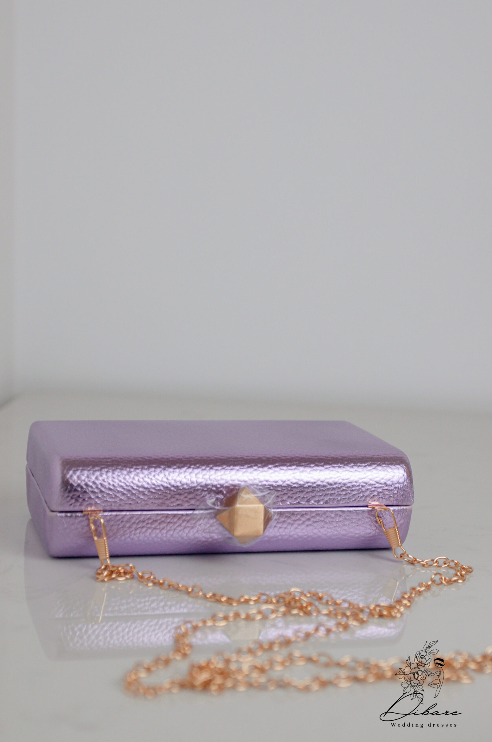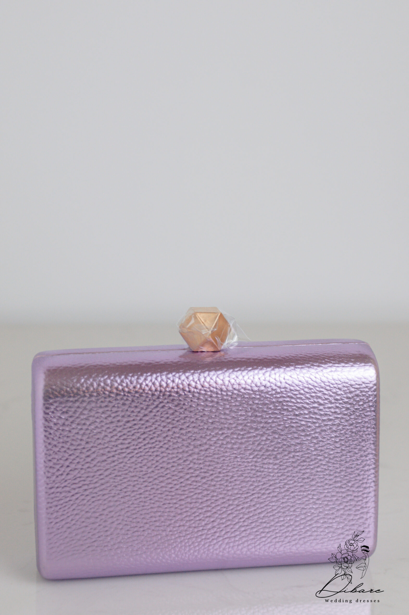 Esta clutch é a personificação da elegância chic e minimalista, sendo o acessório perfeito para injetar uma dose de cor e brilho premium em qualquer look de cerimónia ou evento social. O seu design de caixa rígida apresenta um acabamento metálico texturizado que reflete a luz de forma subtil, conferindo um luxo discreto e moderno. A cor disponível sofisticada e atual: Lavanda Metálico: Suave, romântico e inesperado. O fecho é o seu elemento de destaque: um detalhe geométrico facetado em tom dourado, que funciona como fecho e como uma peça de joalharia integrada, que se encaixa perfeitamente na estrutura. O formato retangular alongado é ideal para ser transportado na mão, conferindo uma pose de extrema elegância.