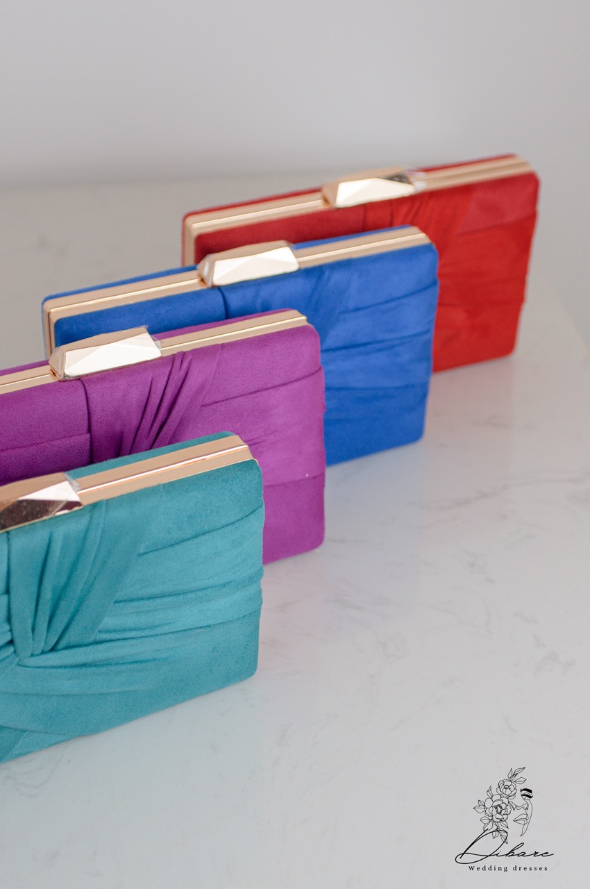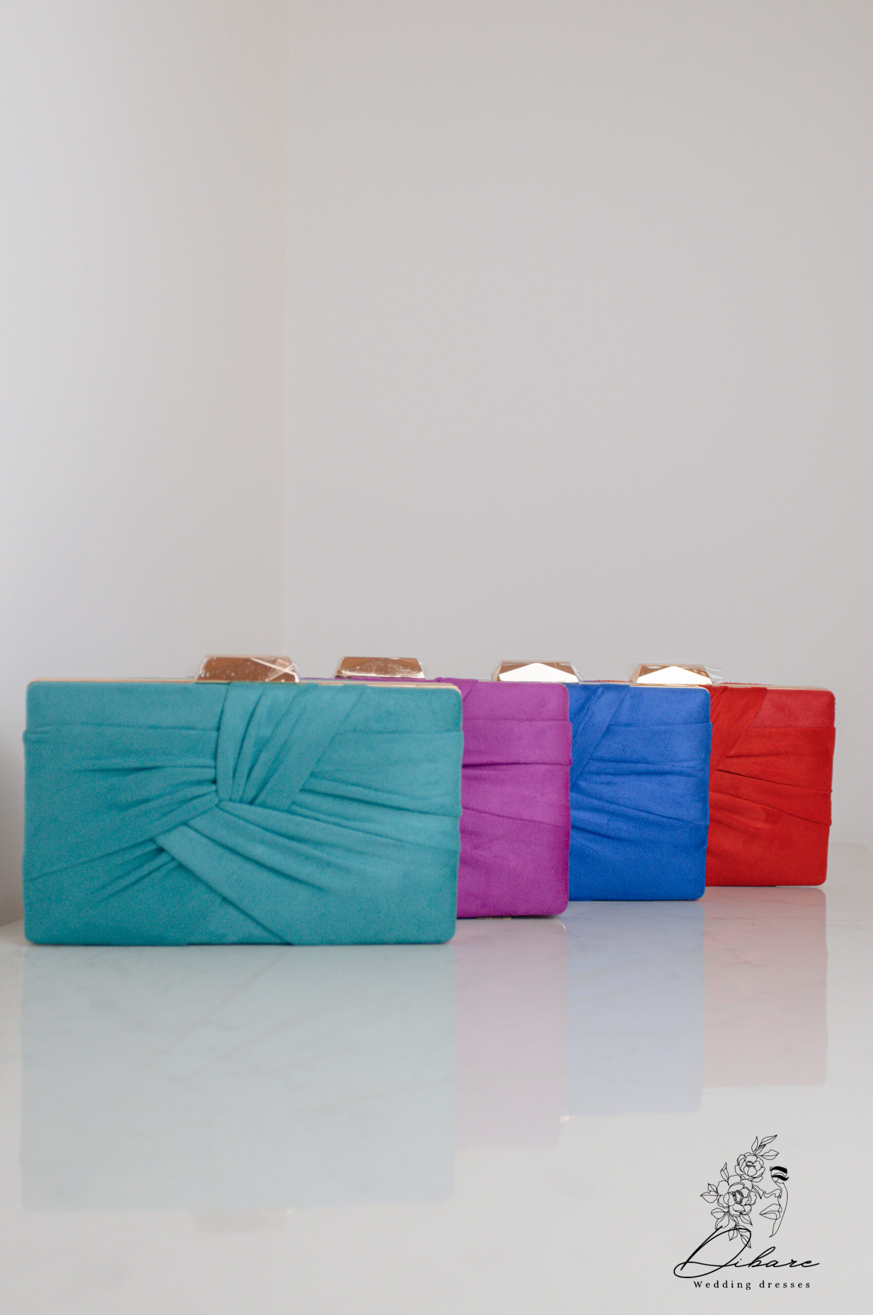 Esta deslumbrante clutch retangular é o acessório perfeito para elevar qualquer look de festa ou evento especial. Confeccionada com um tecido plissado de textura rica, apresenta um elegante e distinto nó decorativo central que confere um toque moderno e sofisticado. O design é realçado pelo seu fecho tipo aba em metal dourado sutilmente visível no topo, proporcionando um contraste chique com a cor vibrante do tecido. A clutch é apresentada numa paleta de cores irresistíveis, incluindo o turquesa, o roxo, um azul e o vermelho clássico, garantindo que haja uma opção perfeita para complementar o seu guarda-roupa.