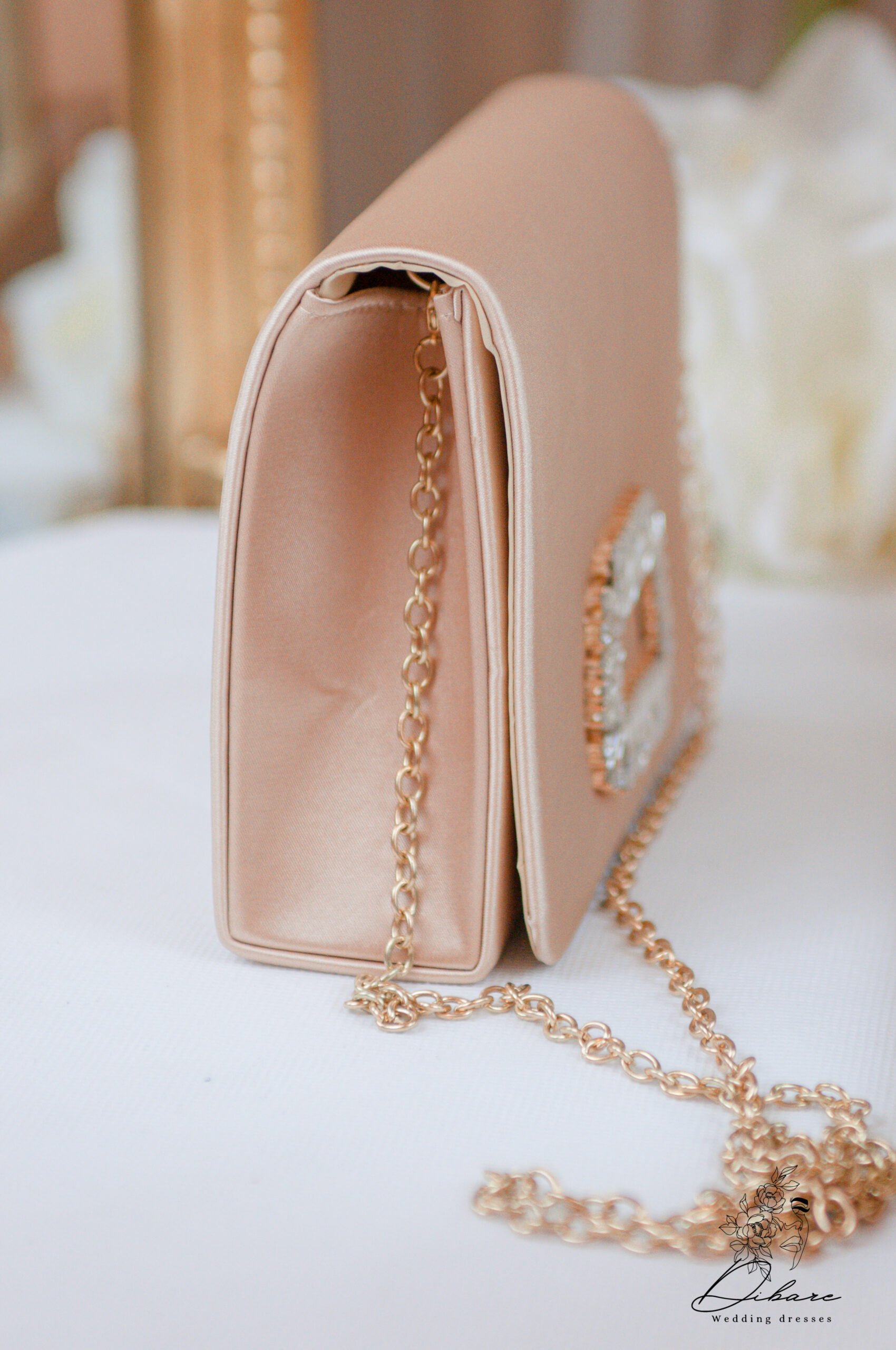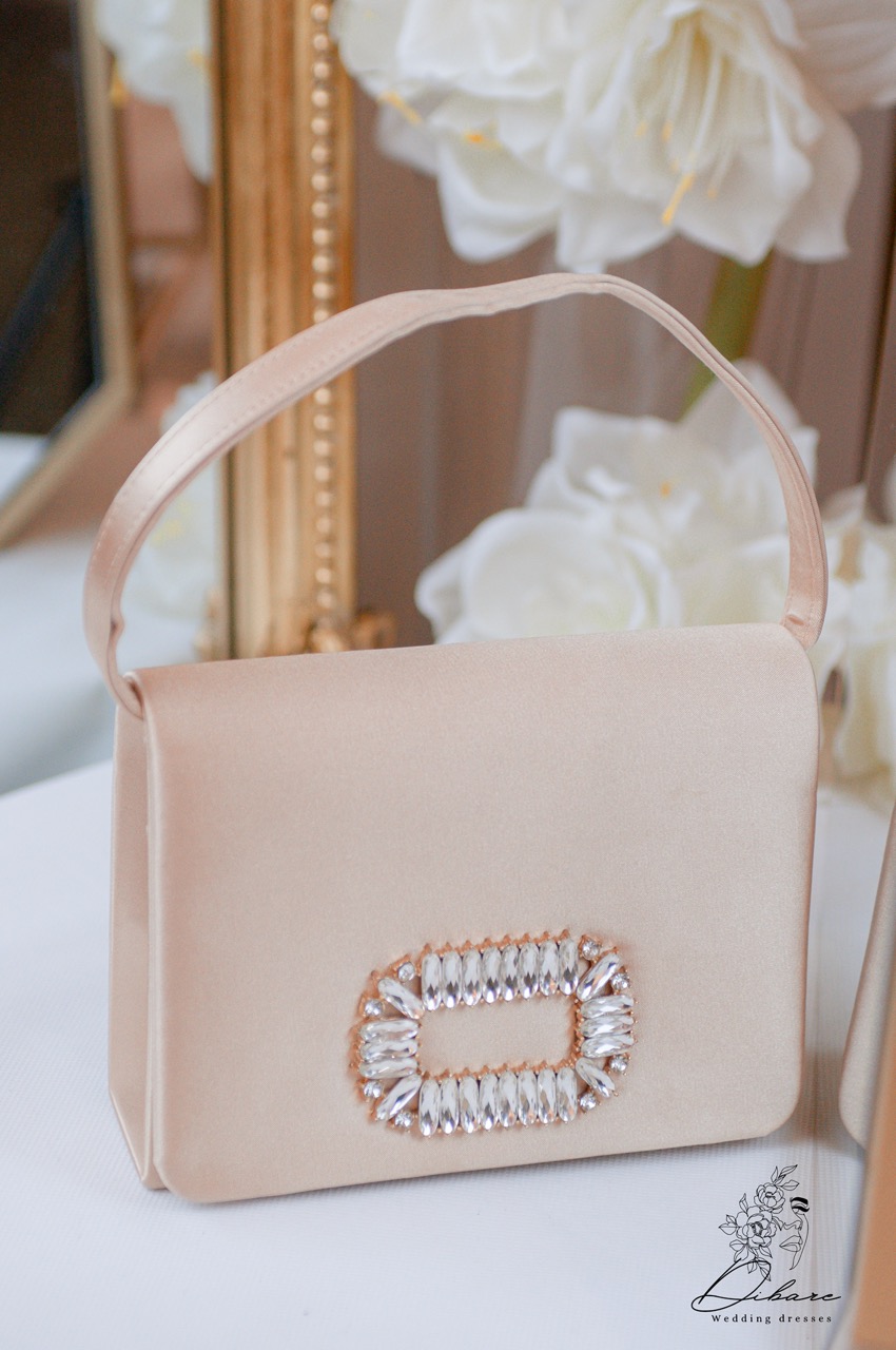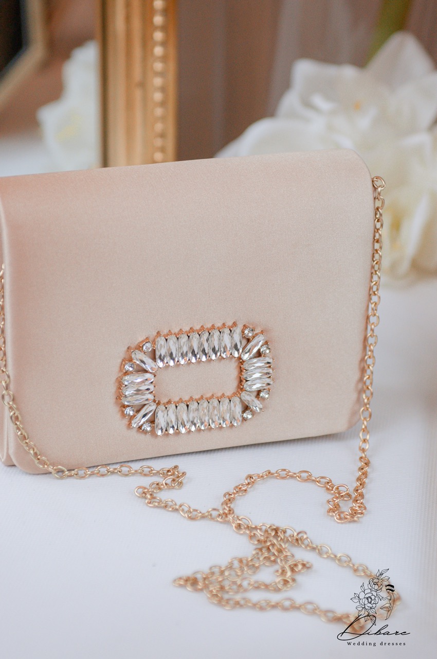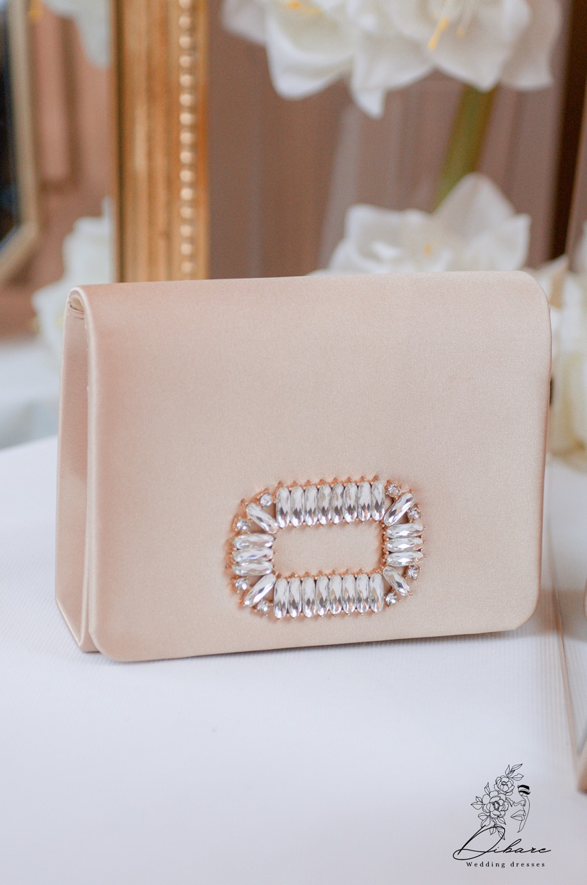 Esta deslumbrante clutch é a definição de sofisticação discreta e brilho subtil, perfeita para complementar o seu visual em eventos especiais, casamentos ou festas de gala. Confeccionada em cetim acetinado num delicado tom nude (ou champanhe claro), a mala apresenta uma textura luxuosa e um acabamento suave. O seu formato estruturado e elegante, estilo envelope, é acentuado por uma espetacular aplicação central de cristais transparentes de corte retangular, dispostos num padrão que lembra uma fivela ou broche. Este detalhe captura a luz de forma magnífica, adicionando um toque de glamour inconfundível.