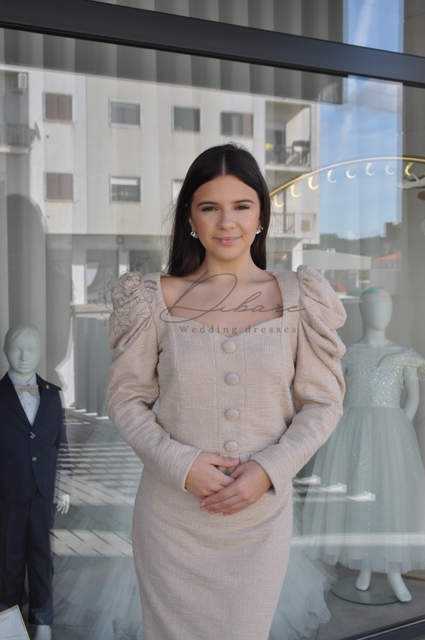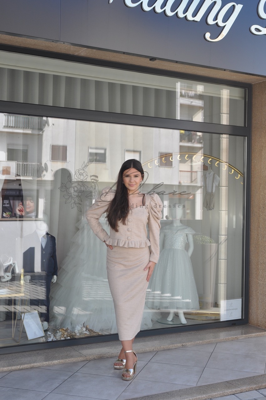 Este elegante conjunto de duas peças em tom bege areia é a escolha perfeita para quem procura uma sofisticação discreta e atemporal. O design prima pelo equilíbrio entre o clássico e o romântico, oferecendo uma silhueta que valoriza as formas femininas de forma suave e refinada. A parte superior apresenta uma blusa de estilo peplum com mangas compridas ligeiramente abaloadas nos ombros, conferindo um toque de estrutura e modernidade. O decote quadrado é realçado por delicados detalhes em folhos, que se repetem na bainha da blusa, criando uma textura visual encantadora. A acompanhar, a saia de corte lápis e comprimento midi ajusta-se suavemente ao corpo, proporcionando uma continuidade fluida e elegante ao visual. Ideal para eventos de dia, como batizados ou cerimónias civis, este conjunto destaca-se pela sua versatilidade, permitindo que as peças sejam usadas em conjunto para um look total coordenado ou separadamente para criar novas combinações.