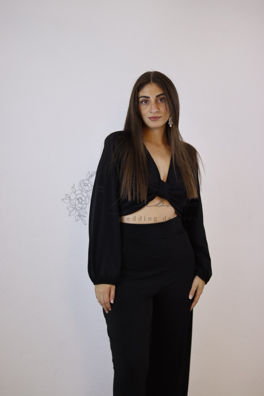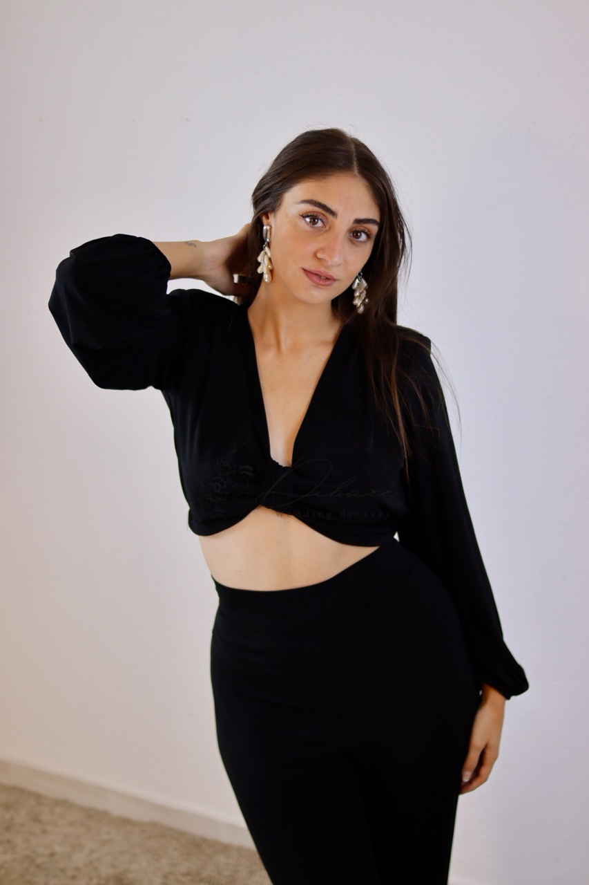 Este elegante conjunto monocromático é a definição de sofisticação moderna e conforto sem esforço. É composto por duas peças essenciais que se complementam na perfeição para criar um look marcante. A peça superior é um cropped top de manga comprida, com um decote em V profundo e um detalhe de nó frontal que confere um toque arrojado, realçando subtilmente a silhueta. As mangas compridas proporcionam um equilíbrio elegante, tornando-o versátil para diversas ocasiões. A peça inferior é uma calça de cintura alta com um corte amplo e fluido, que alonga a figura e oferece um movimento gracioso. O tecido, de cor preta profunda, exala luxo e versatilidade, permitindo-lhe transitar facilmente de um evento noturno para um ambiente mais casual e chic.