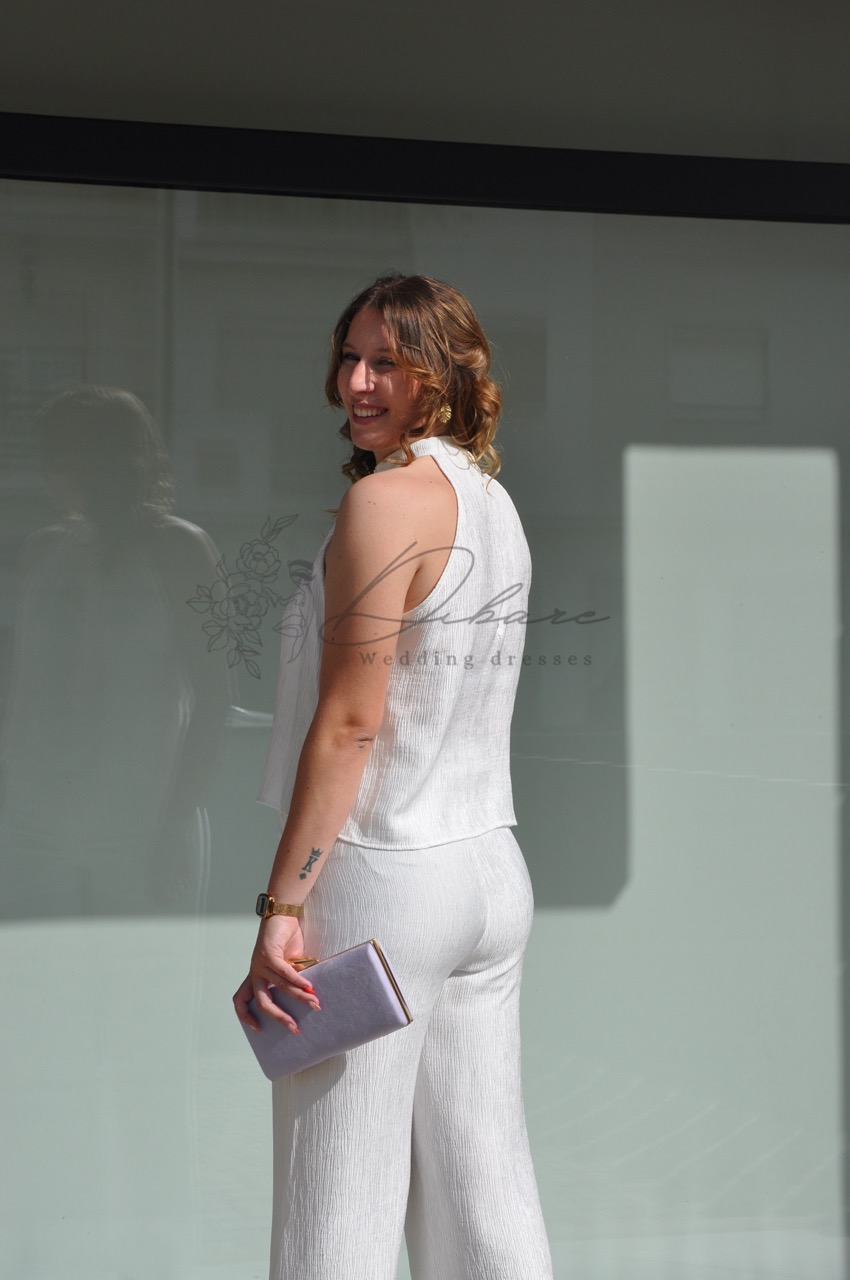 Este conjunto exala elegância moderna com um toque de leveza, sendo a escolha ideal para eventos diurnos ou noturnos que exijam um código de vestuário chique. A peça superior é um top de gola alta no tom imaculado de branco, apresentando detalhes de linhas verticais que adicionam textura e alongam a silhueta. O corte halter sem mangas confere um ar sofisticado e contemporâneo, perfeito para destacar os ombros. A combinação é feita com umas calças Palazzo de cintura alta, também em branco, que fluem graciosamente. O corte amplo e a bainha comprida garantem um movimento elegante e um conforto notável, ao mesmo tempo que criam uma silhueta alongada e imponente.