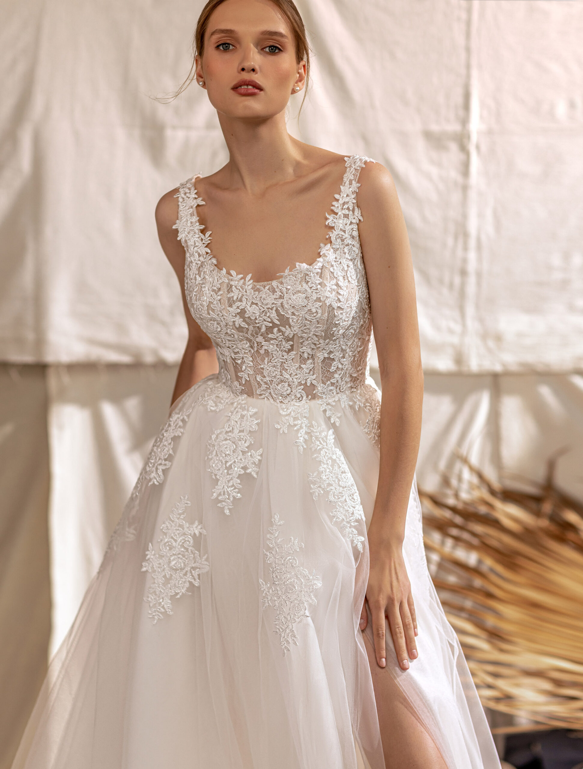 Este modelo combina a leveza do estilo boémio com o detalhe clássico da renda floral. O corpete é caracterizado por um decote arredondado e alças largas trabalhadas que oferecem conforto e um suporte elegante. A renda delicada estende-se da cintura para a saia, fundindo-se com camadas de tule macio que criam um movimento gracioso. O design é finalizado com uma racha lateral contemporânea, que adiciona um toque de leveza e modernidade à silhueta A-line. É a escolha ideal para noivas que procuram um visual romântico, fresco e perfeito para casamentos ao ar livre.