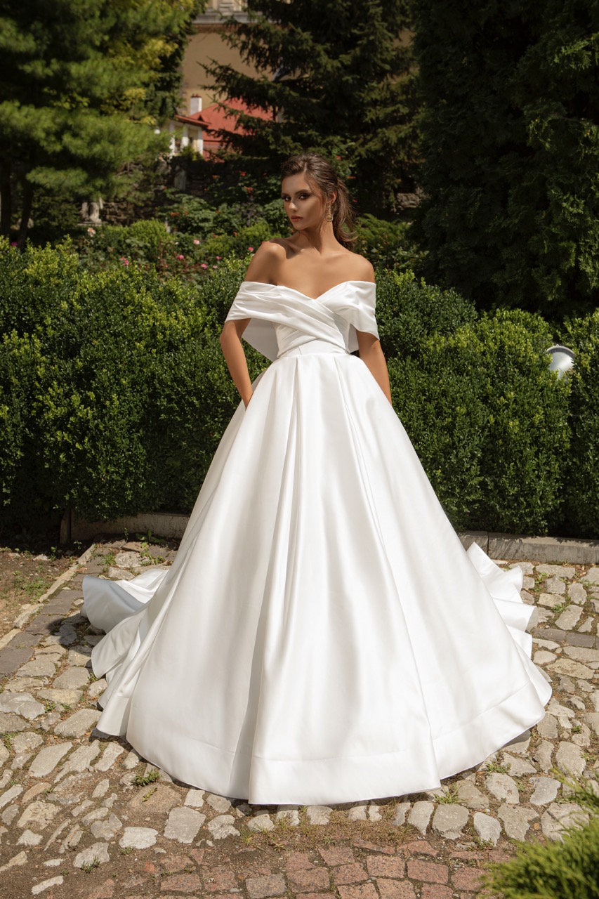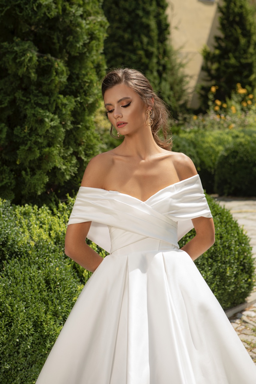 O modelo Ellie é a definição da elegância real e intemporal. Este vestido de silhueta princesa destaca-se pelo seu corpete estruturado com um sofisticado decote drapeado de ombro caído (off-the-shoulder), que cria uma moldura graciosa para o colo e as costas. Confecionado num cetim de brilho luxuoso, a saia ampla apresenta pregas profundas que conferem um volume arquitetónico e imponente, incluindo bolsos laterais discretos para um toque de modernidade funcional. A longa cauda completa este visual digno de um conto de fadas moderno, perfeito para noivas que procuram uma presença inesquecível e clássica.