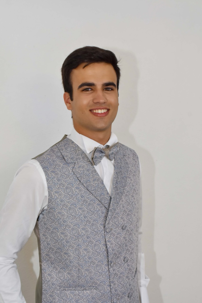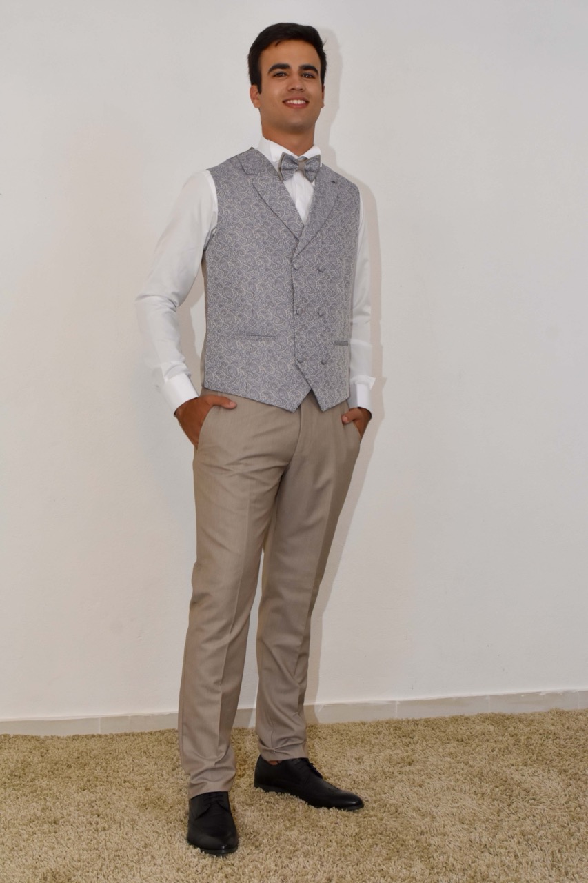 Este fato de três peças em tom bege areia é a definição máxima de sofisticação descontraída, sendo a escolha perfeita para eventos de prestígio em ambientes costeiros ou campestres. Com uma estética luminosa e natural, este conjunto foi desenhado para o homem que valoriza um estilo clássico com uma abordagem contemporânea e leve. Confeccionados num tecido de alta qualidade com textura subtil, o casaco apresenta lapelas de entalhe e um corte slim fit que acentua a postura de forma elegante. As calças coordenadas mantêm a linha moderna, oferecendo um ajuste preciso e confortável. O ponto de destaque deste conjunto é o colete cinza perla em trespasse. Com seis botões e lapelas em bico, adiciona uma camada de formalidade e estrutura que eleva instantaneamente o visual. A combinação do bege terra com o cinza suave do colete cria um contraste orgânico e equilibrado. O visual é finalizado com um laço coordenado, ideal para manter a etiqueta num contexto de celebração ao ar livre.